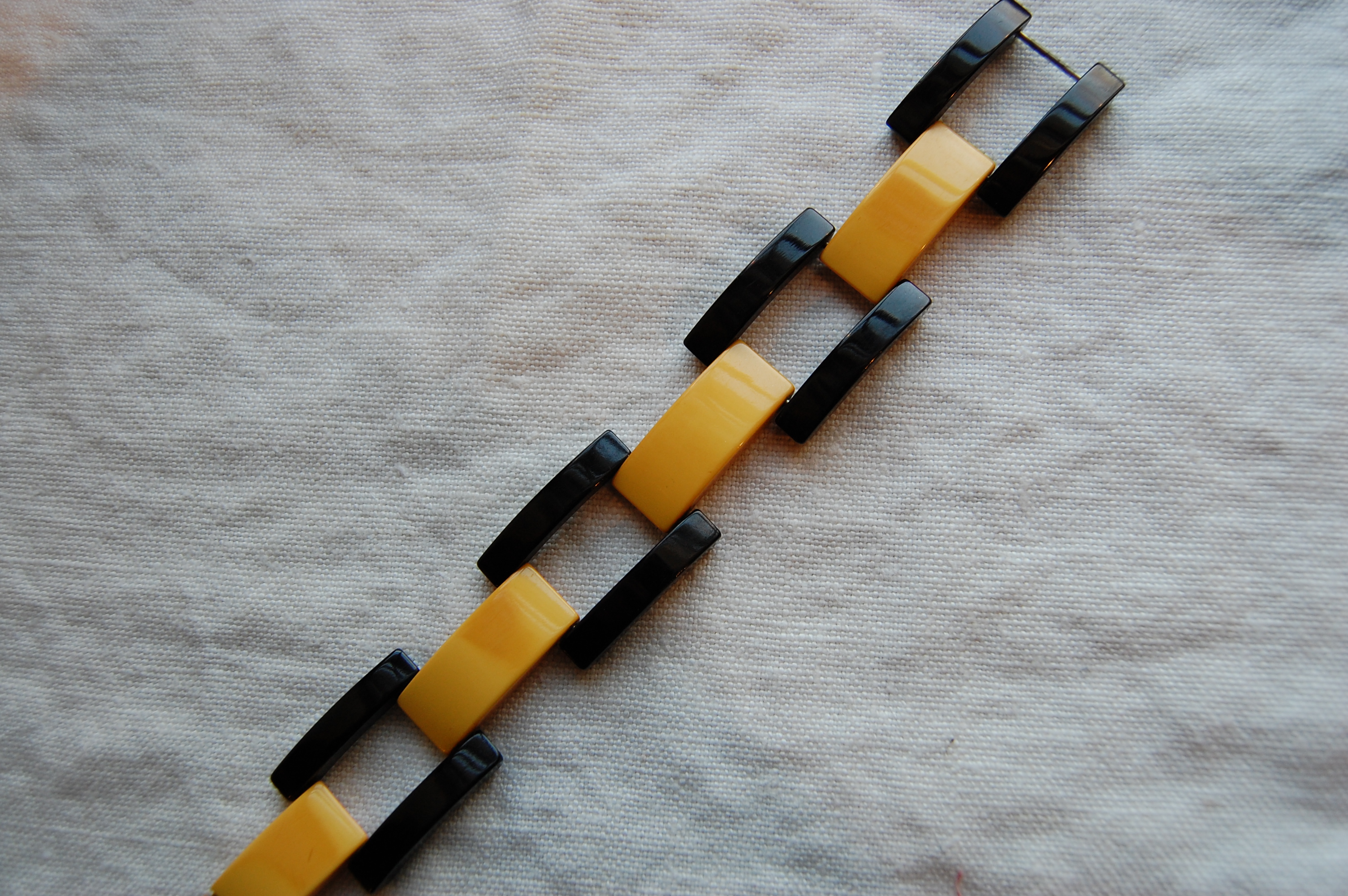 I bought them without knowing how or when I would use them, but they definitely had my name on them – and they came home to Pennsylvania with me! What I would have loved to have also brought home with me was a black and yellow Bakelite bracelet, which caught my eye at another booth later in the day. I resisted buying it as we had already done our part to support the economy…! What I did not know was that my sneaky daughter quickly purchased this bracelet while I went to the ladies’ room – and she, her husband Jon, and our son Nate surprised me with it for Christmas! Here it is: