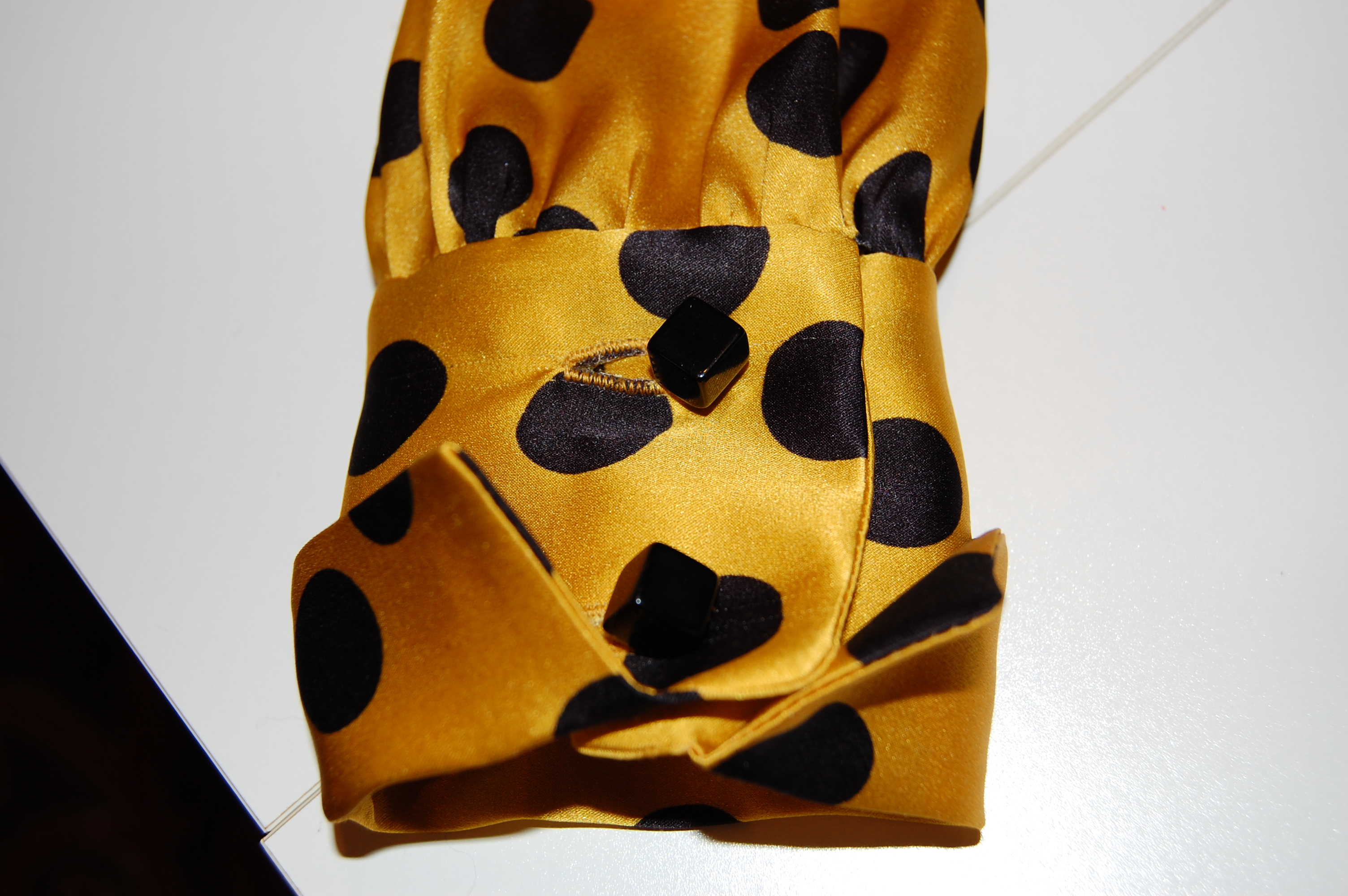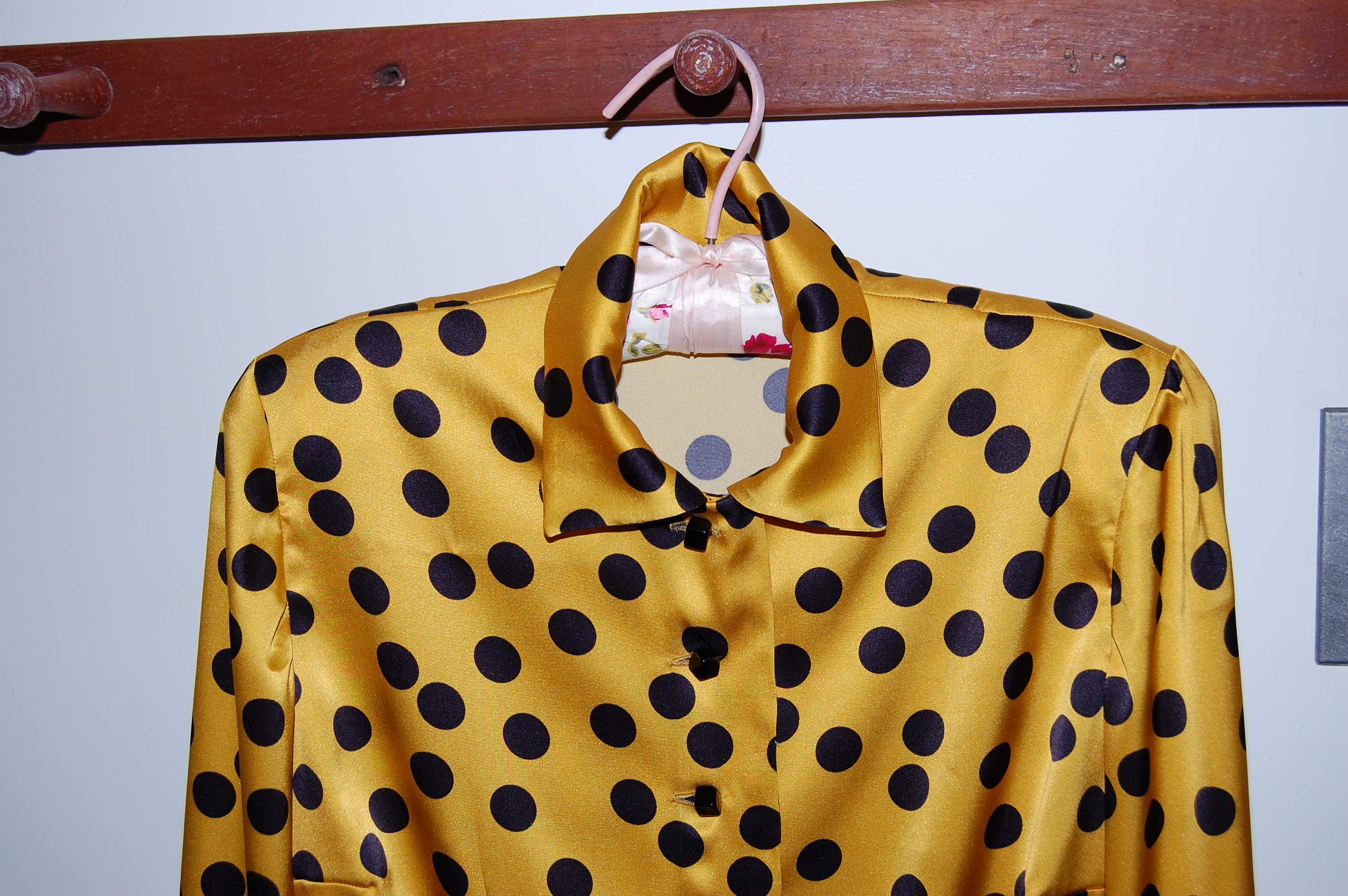– The fabric, both in design and color, makes a statement, so it needs buttons which are not wimpy. The square-ish shape of the buttons helps them stand up to those demonstrative polka dots without distracting from them.