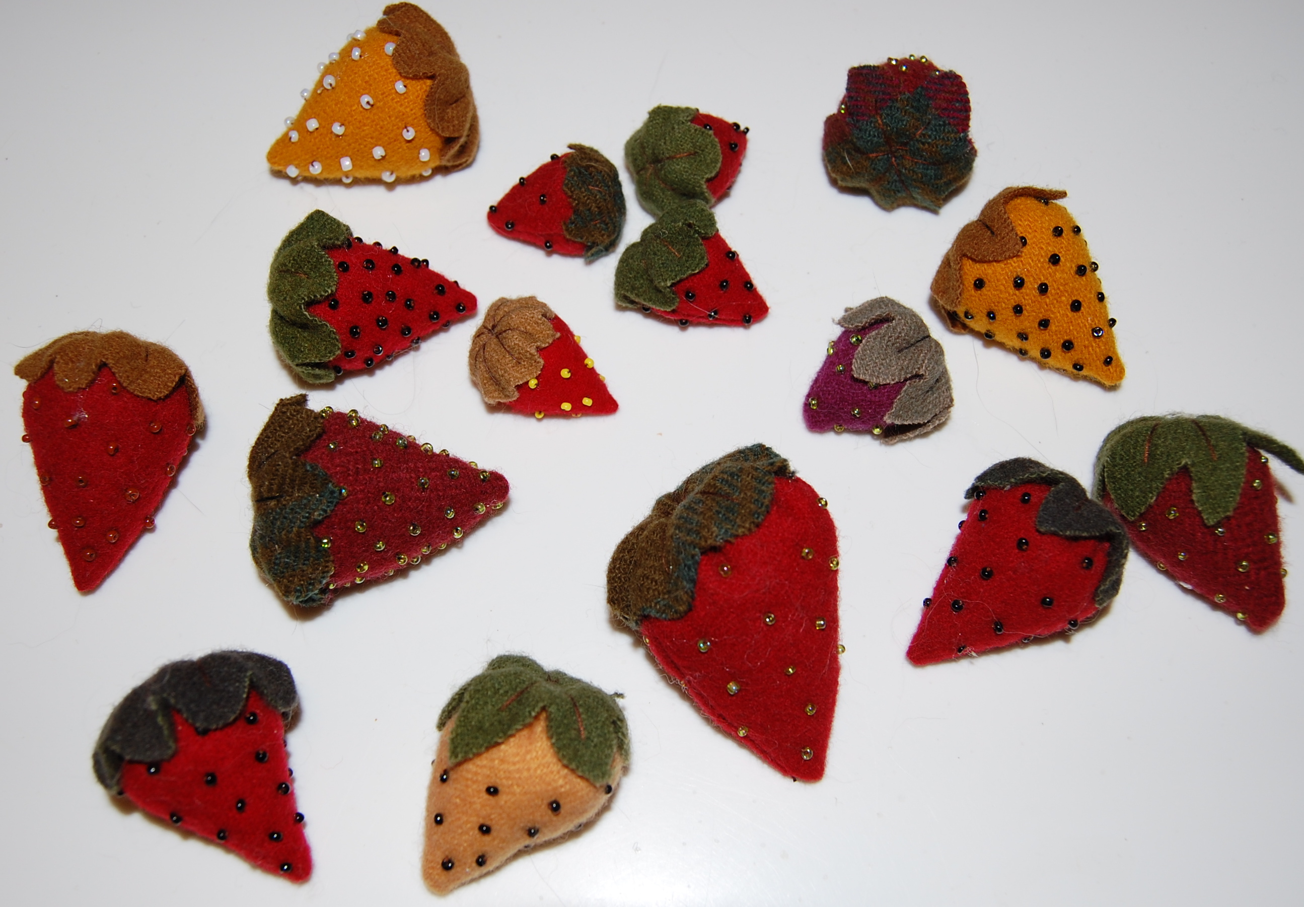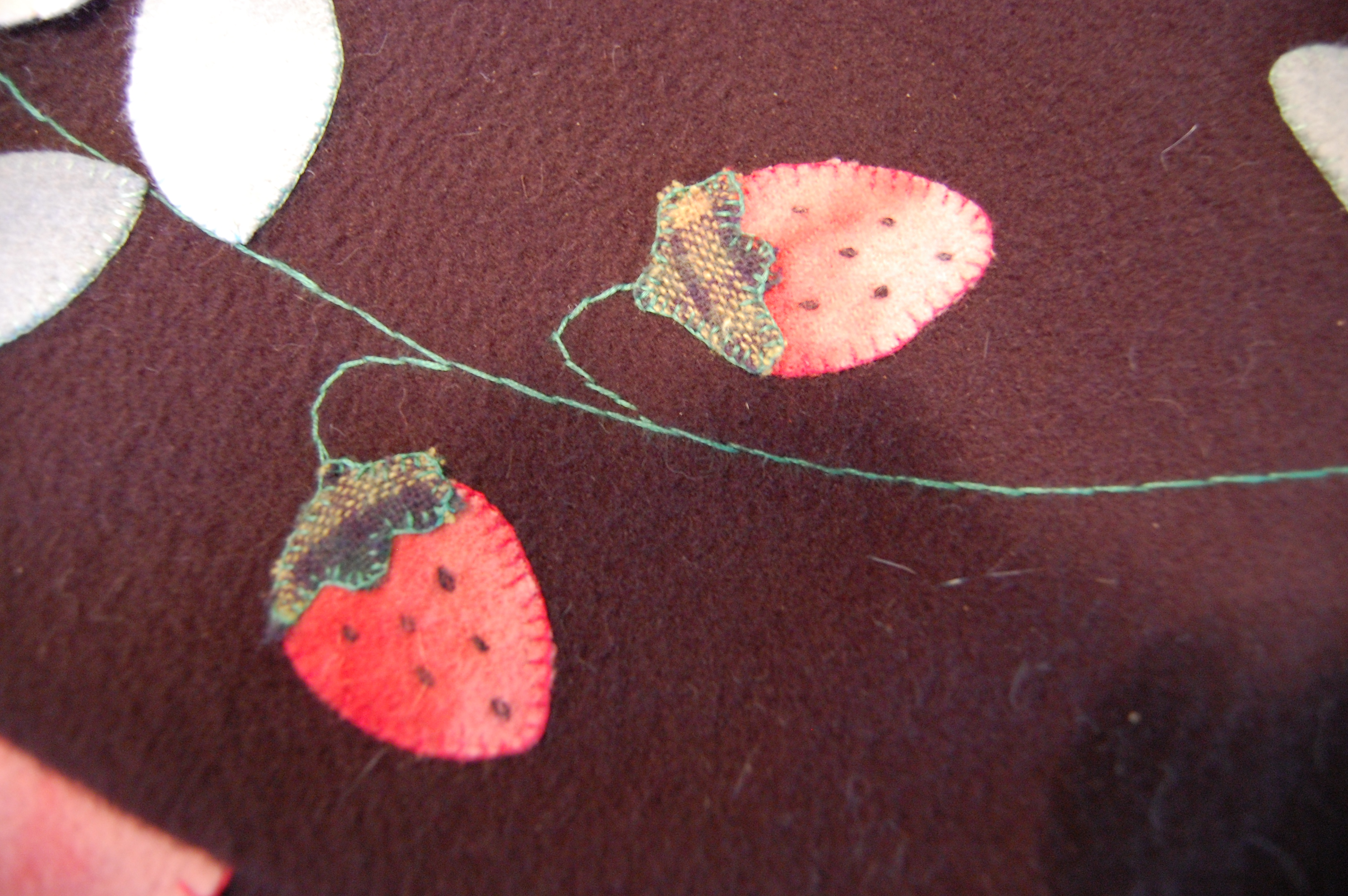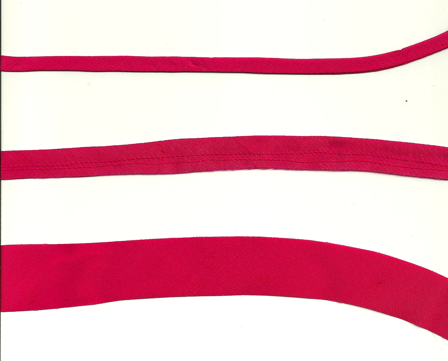 From top to bottom, the making of the strips for the buttonholes and details: 1″ wide bias strip, one folded and stitched, one turned and finished! (Click on the photo to see these close-up.)