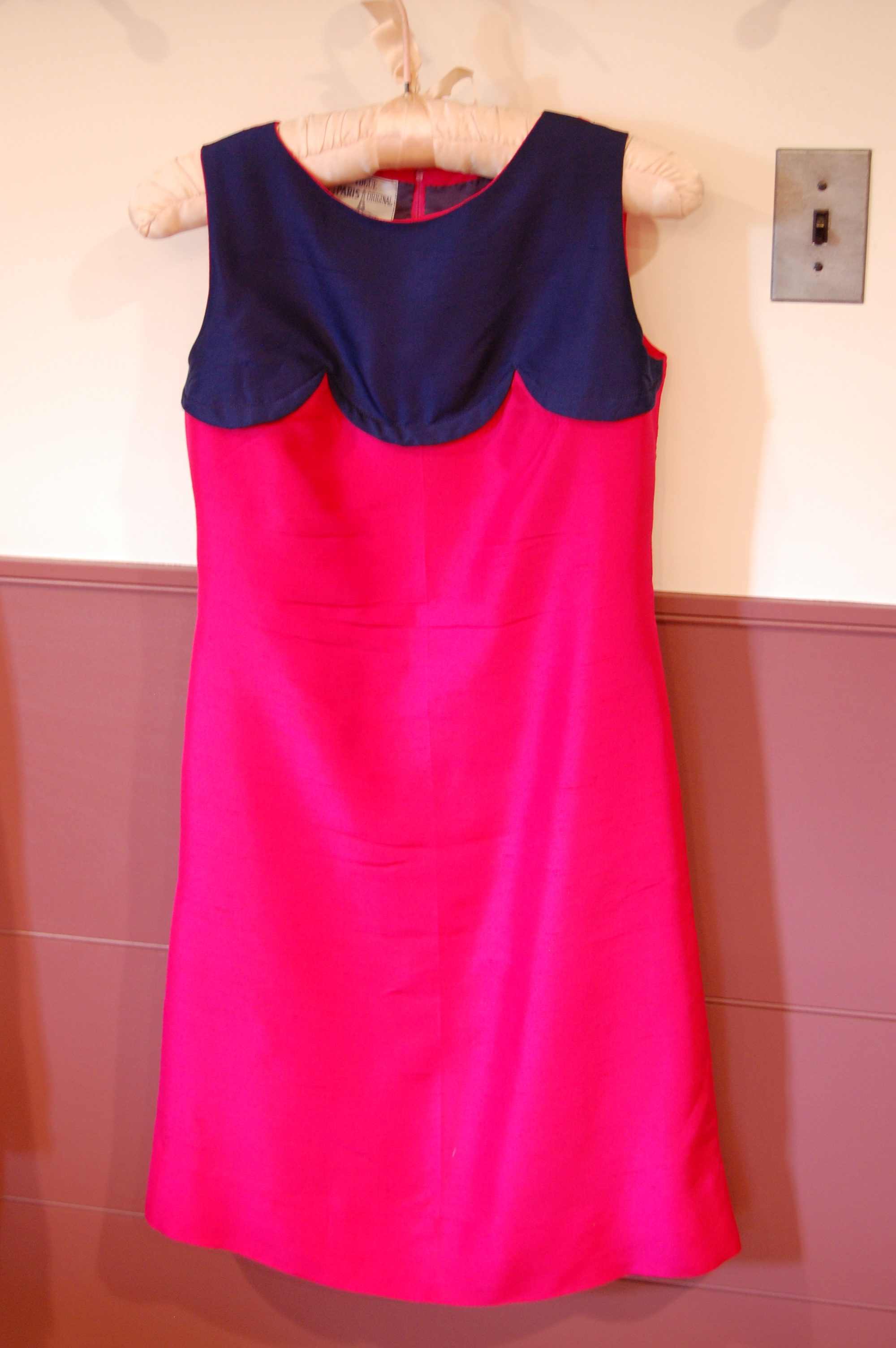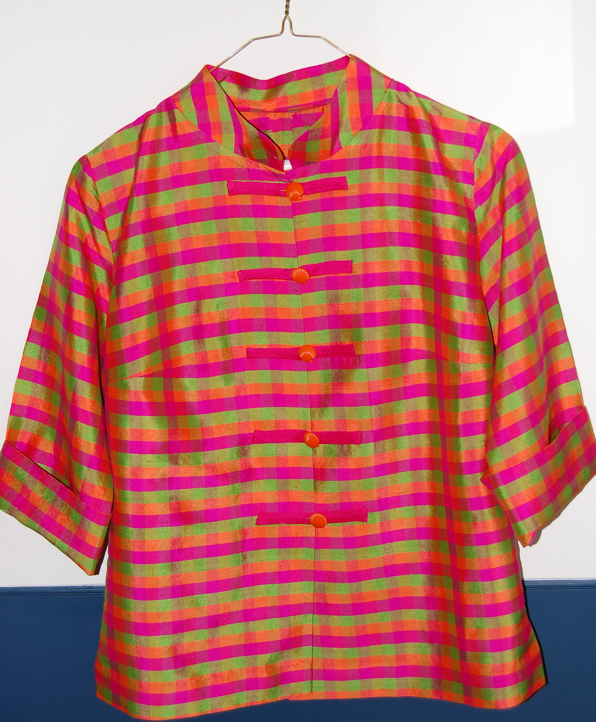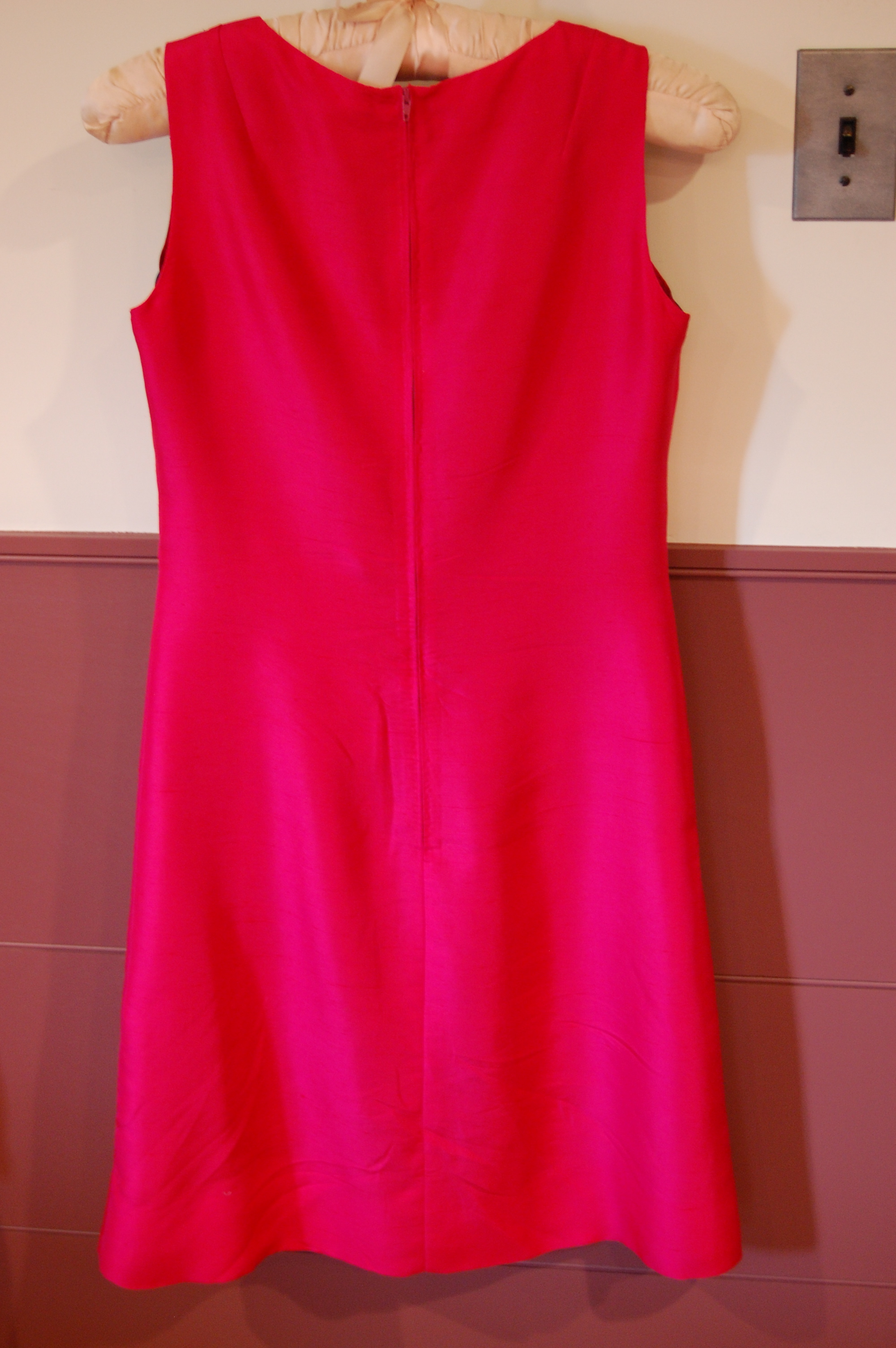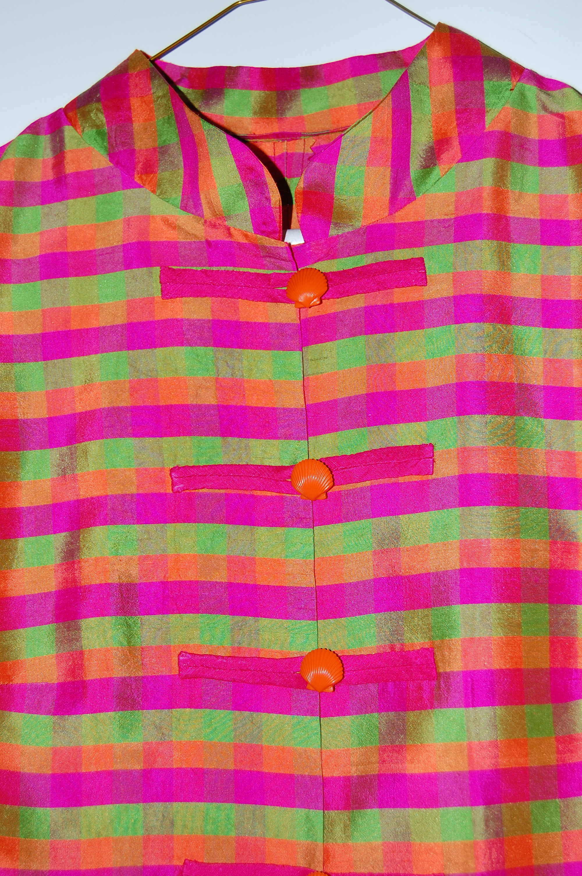 I had the fabric swatch sitting on my ironing board in my sewing room when I started work on my “Pierre Cardin” dress. The pink silk from that dress complimented this silk check so much that, putting the two together seemed inevitable. I played around with some small scraps, scrunching them around those orange shell buttons, still on their card. What could be more perfect than making the buttonhole loops and details out of the pink fabric, to set off those shell buttons? I was sure that would be much more effective than making the loops and details out of the same checked fabric.