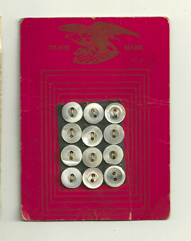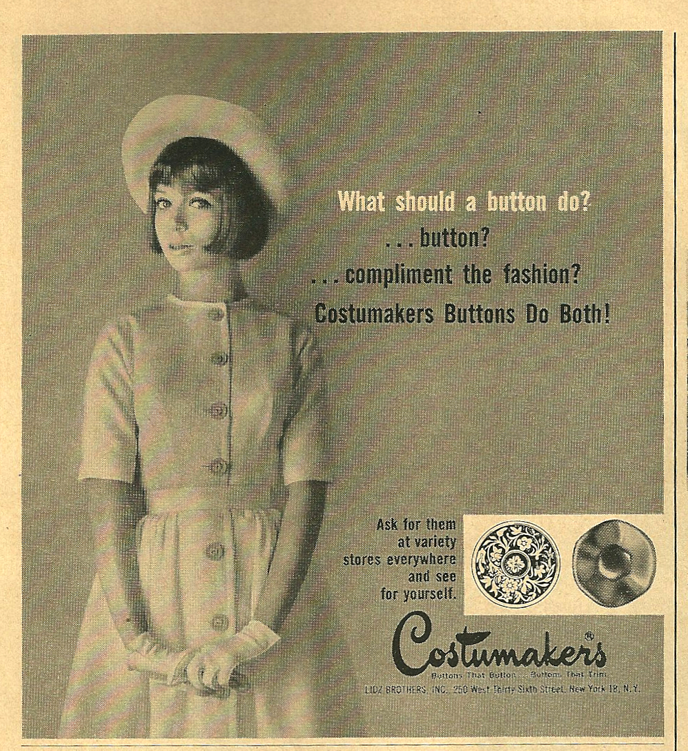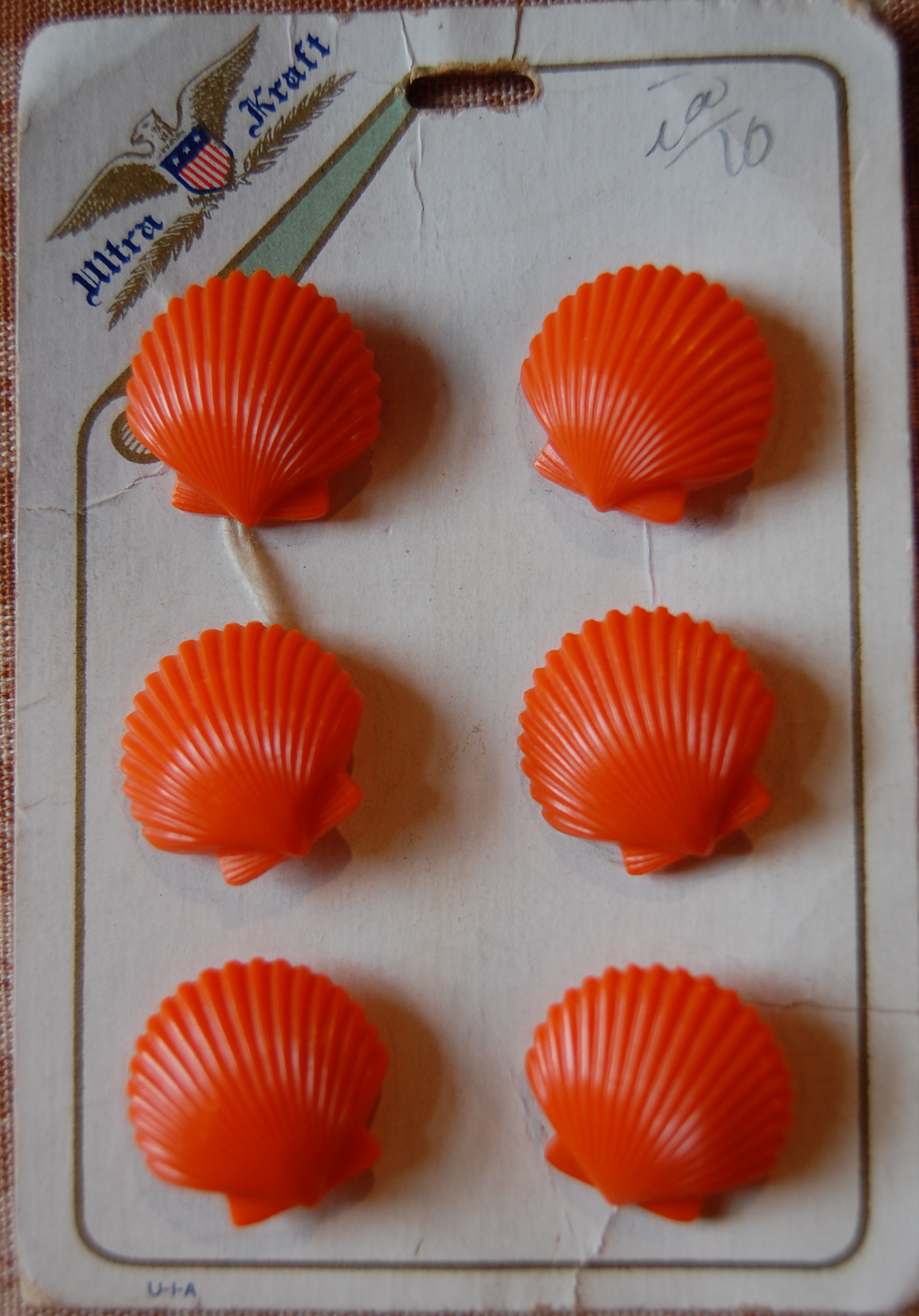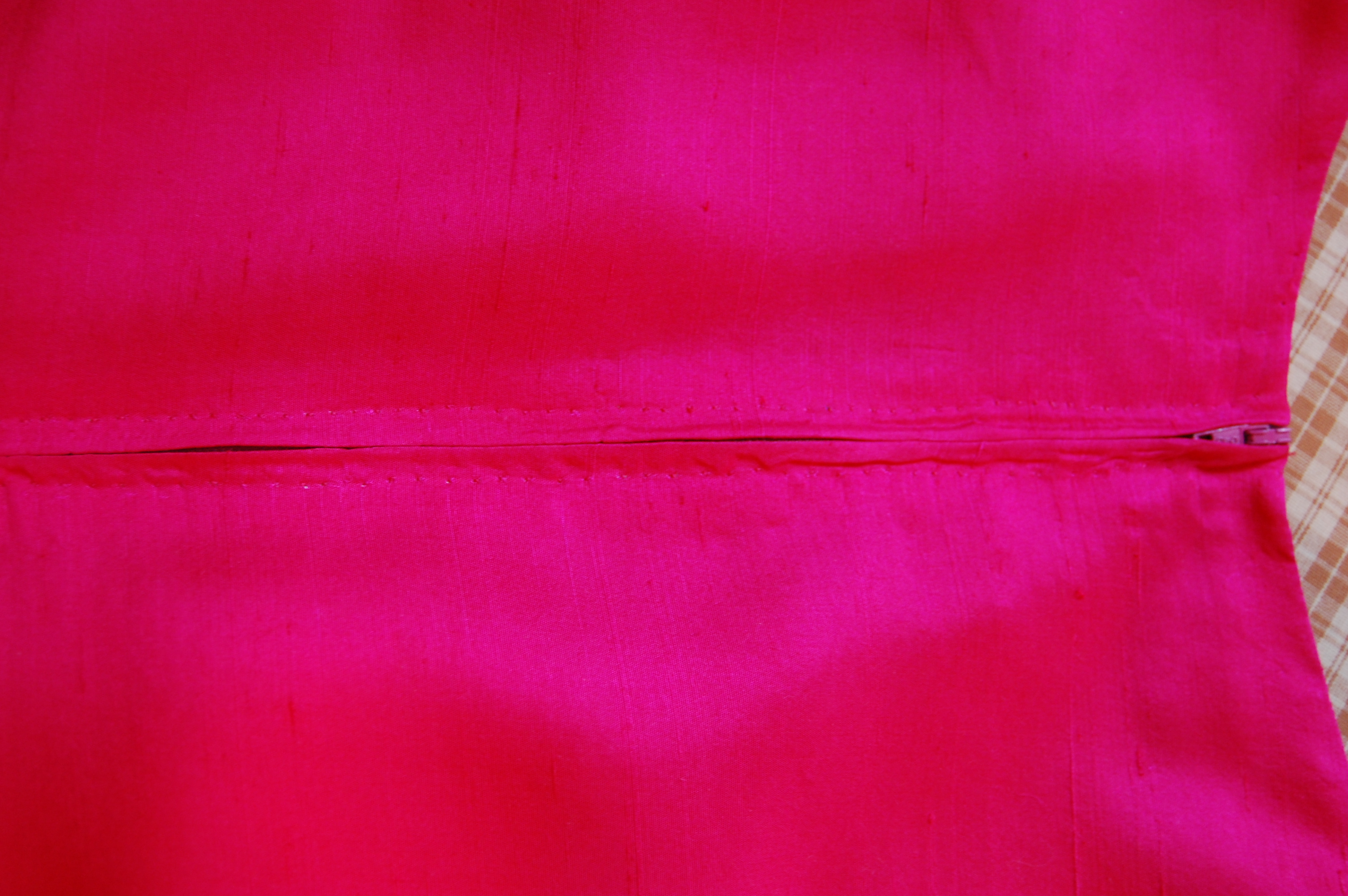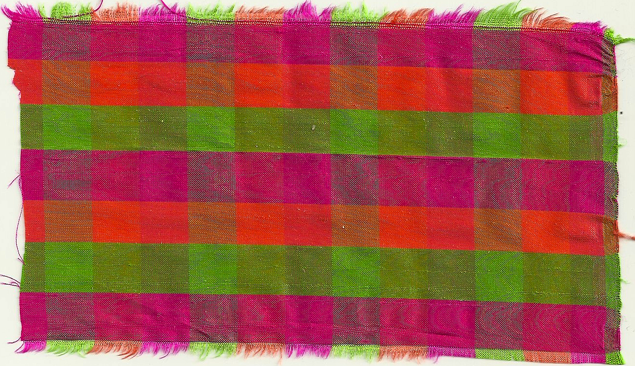 I had the fabric swatch sitting on my ironing board in my sewing room when I started work on my “Pierre Cardin” dress. The pink silk from that dress complimented this silk check so much that, putting the two together seemed inevitable. I played around with some small scraps, scrunching them around those orange shell buttons, still on their card. What could be more perfect than making the buttonhole loops and details out of the pink fabric, to set off those shell buttons? I was sure that would be much more effective than making the loops and details out of the same checked fabric.