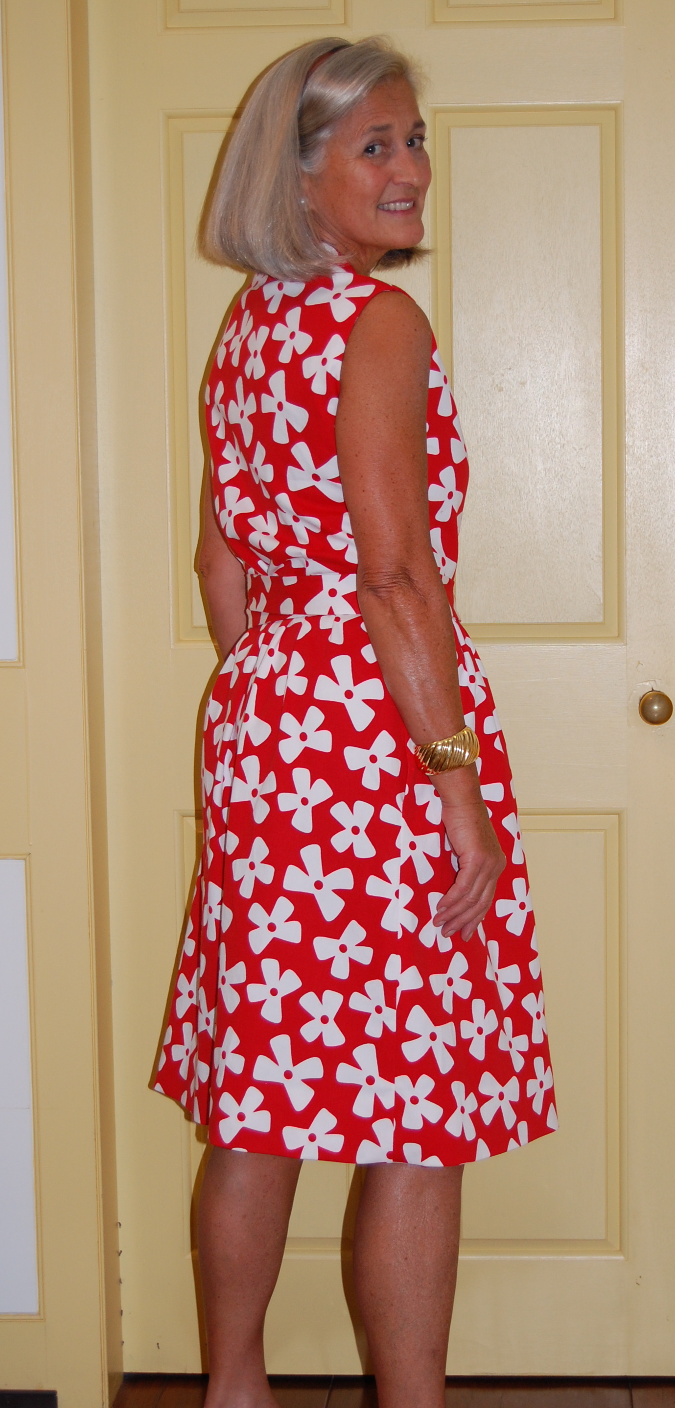 Instead of turning under edges on the facings, I double-stitched and pinked the edges, and used stretchable hem tape for the hem. It all seemed to work and here is the finished dress: