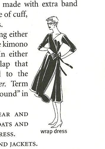 But – what came before Von Furstenberg’s classic dress? Many of us remember our “wraparound” skirts from the ‘60s and ‘70s – some were “reversible”, some were made of a lightweight sailcloth type of fabric and were kind of stiff, some were gathered, and some were A-line. Towards the late ‘60s, according to The Fairchild Dictionary of Fashion (3rd Edition, Fairchild Publications, Inc., New York, 2010), the term “wraparound” was shortened to just “wrap” – and that is the term we know and use today. The illustration in this book surely is based on DVF’s classic wrap dress.