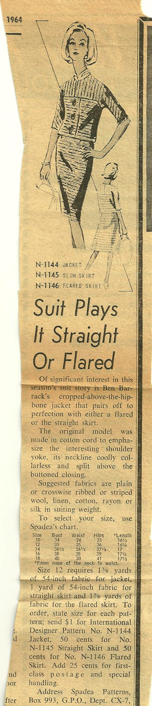 The first clipping is for another pattern – a Spadea, available through mail order from the newspaper. Fortunately, the date of 1964 shows up on one corner.