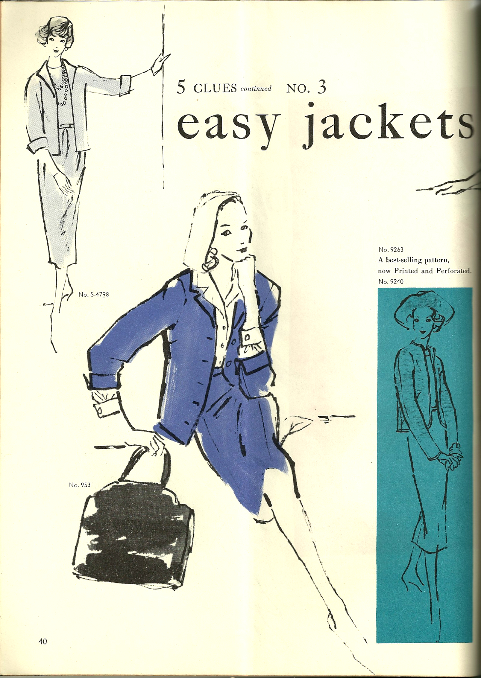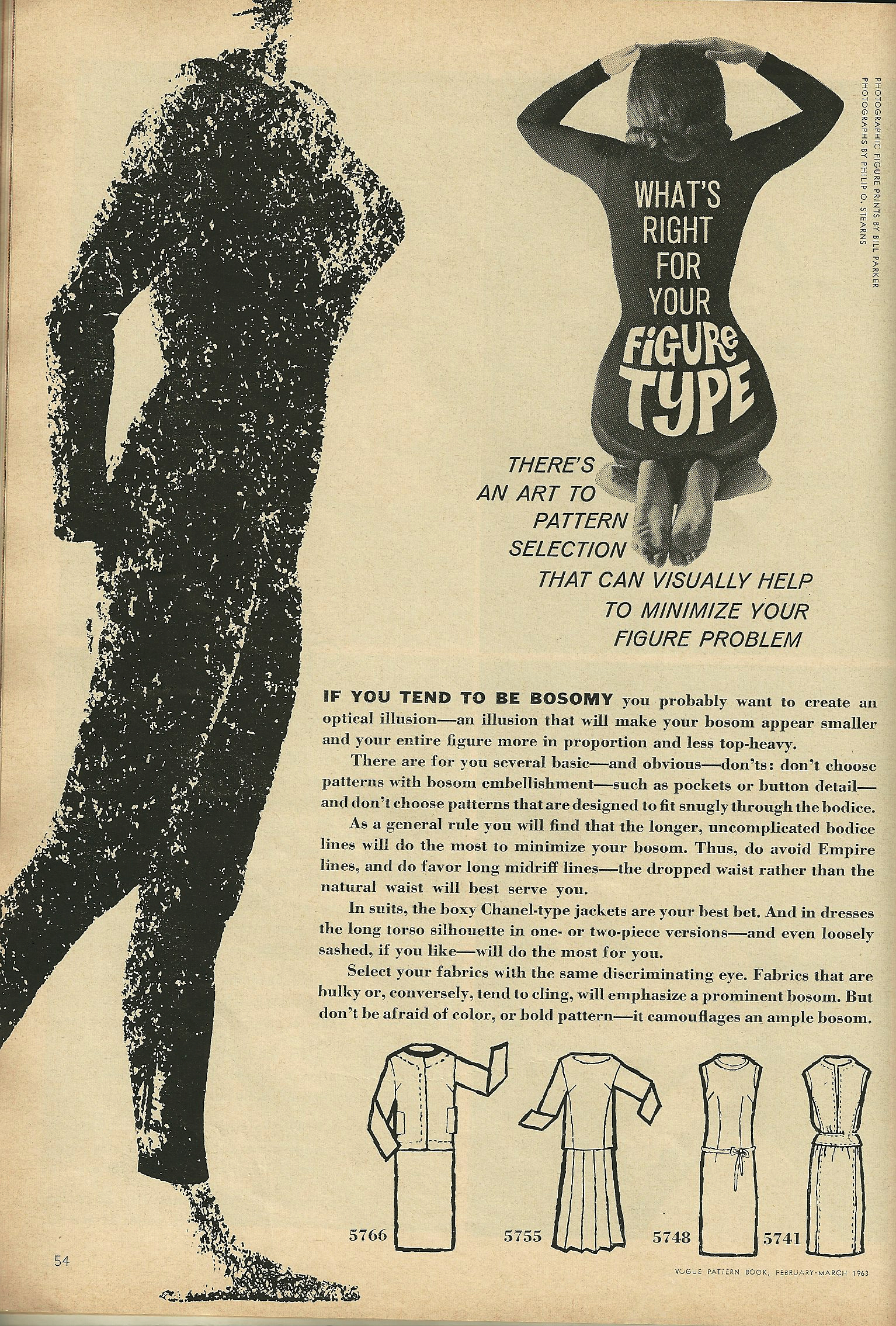 Finally, an article in the February/March 1963 issue of the magazine gave some of that age-old advice on “pattern selection that can visually help to minimize your figure problem.” The advice given “if you tend to be bosomy” seems like it could be good advice for just about every figure problem (or problem figure, depending on your point of view) as it states “In suits, the boxy Chanel-type jackets are your best bet…”