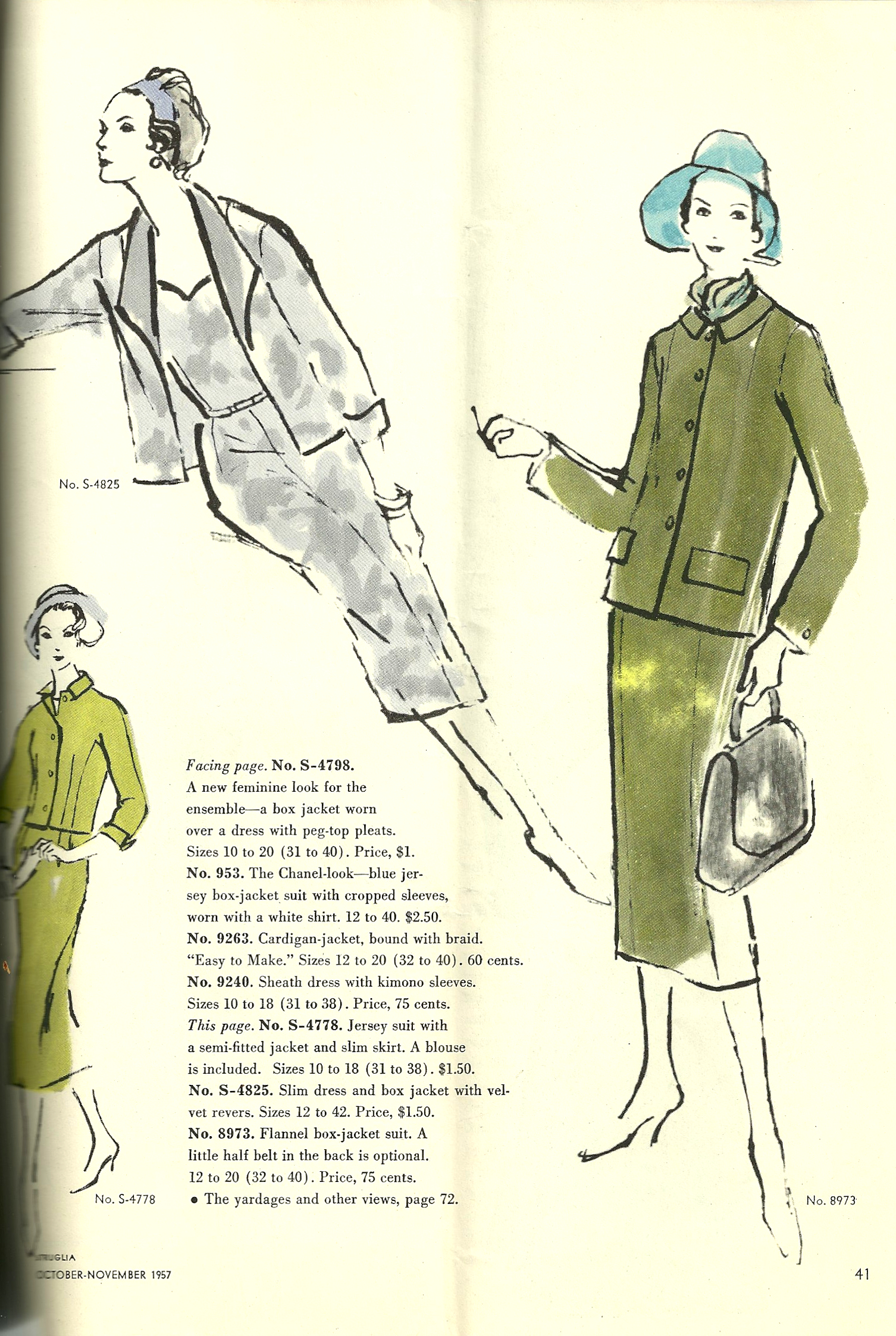 Having classic “Chanel” on my mind has made me think about how enduring this style jacket has been over so many decades. From looking through some of my Vogue Pattern Book Magazines from the 1950s and 1960s, it is obvious that this is one fashion that is always in Vogue (pardon the pun). The October/November 1957 issue stated “The Chanel look of the easy jacket is in the news in both suits and ensembles. Box jackets often have cropped sleeves to show cuff-linked shirt sleeves.” Here is how that statement is llustrated: