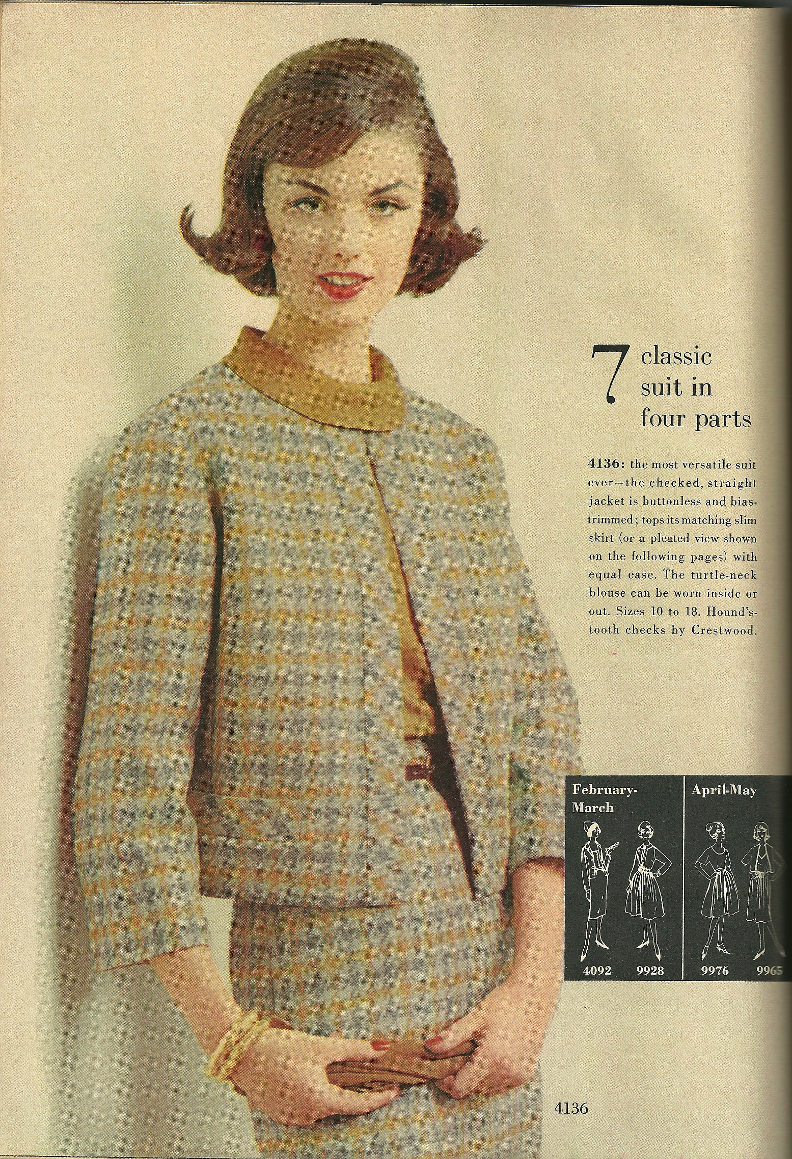 Shades of Chanel are obvious in this style from the August/September 1960 issue, with the statement: “[T]he most versatile suit ever – the checked, straight jacket is buttonless and bias-trimmed…”
