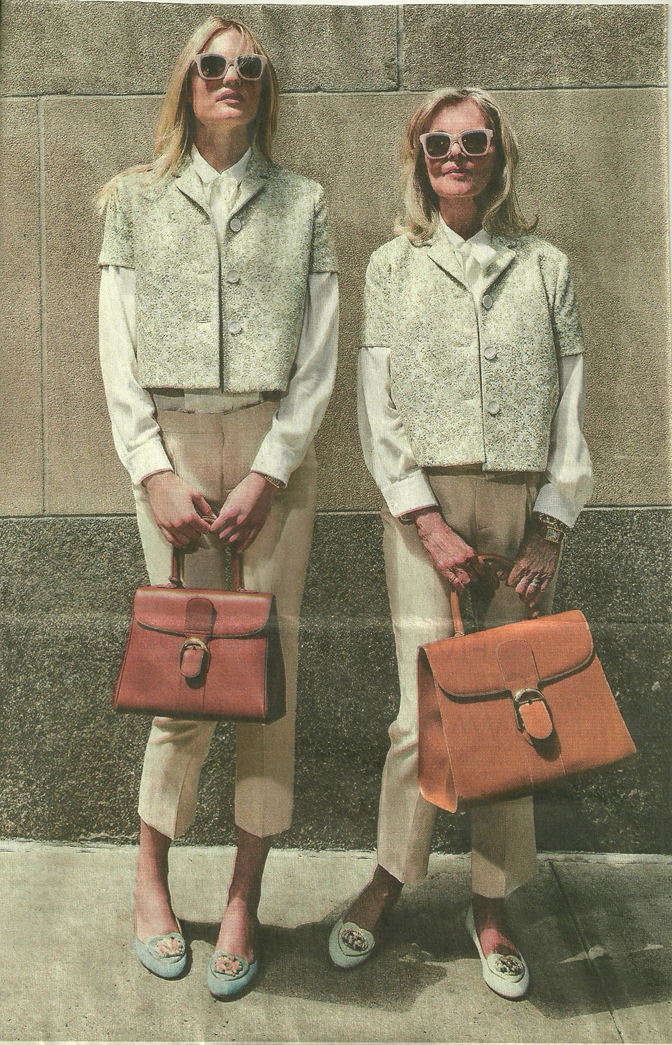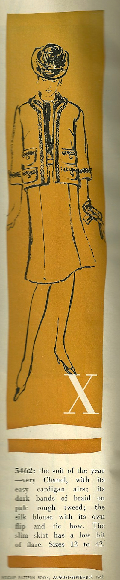 Two years later, the August/September issue included a classic Chanel-look suit in its wardrobe for Vogue’s fictional character, Mrs. Exeter. Called “the suit of the year”, it is described as “. . . very Chanel, with its easy cardigan airs; its dark bands of braid on pale rough tweed; the silk blouse with its own flip and tier bow. The slim skirt has a low bit of flare.”