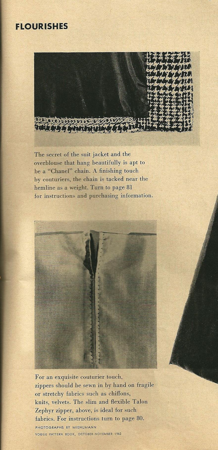 That same issue of Vogue Pattern Book Magazine gave away this “secret” in a feature entitled VPB’s Boutigue Corner: Couturier Flourishes: “The secret of the suit jacket and the overblouse that hang beautifully is apt to be a “Chanel” chain. A finishing touch by couturiers, the chain is tacked near the hemline as a weight.”