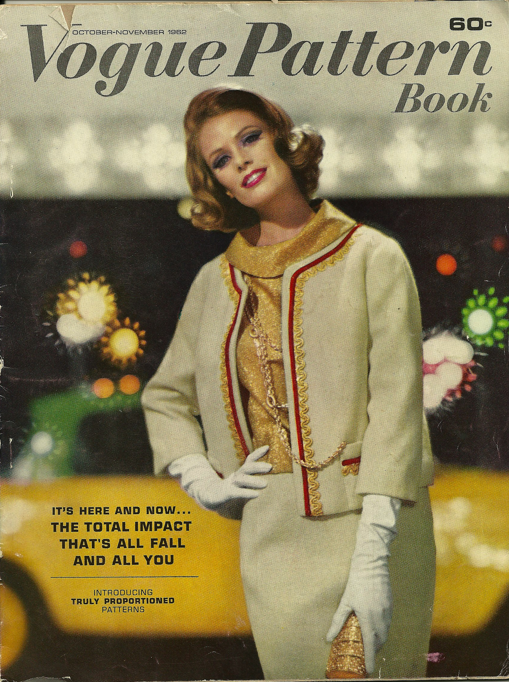 The very next issue in 1962 featured a classic Chanel look on its cover. The accompanying caption states: “Take a clean-lined suit design (shades of Chanel) and make it shimmer: a springy white suit wool scored with gold metallic and red braid . . .”