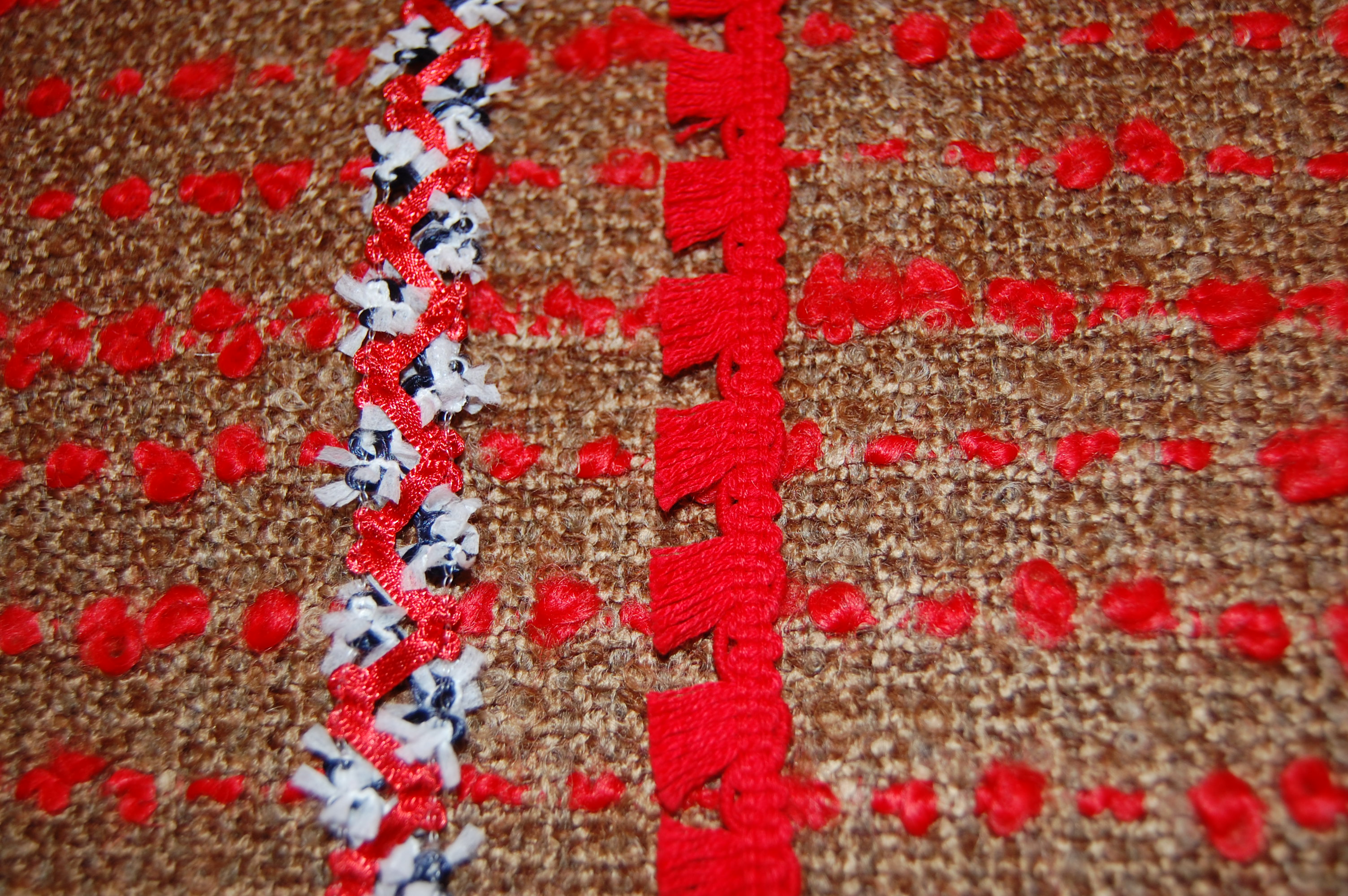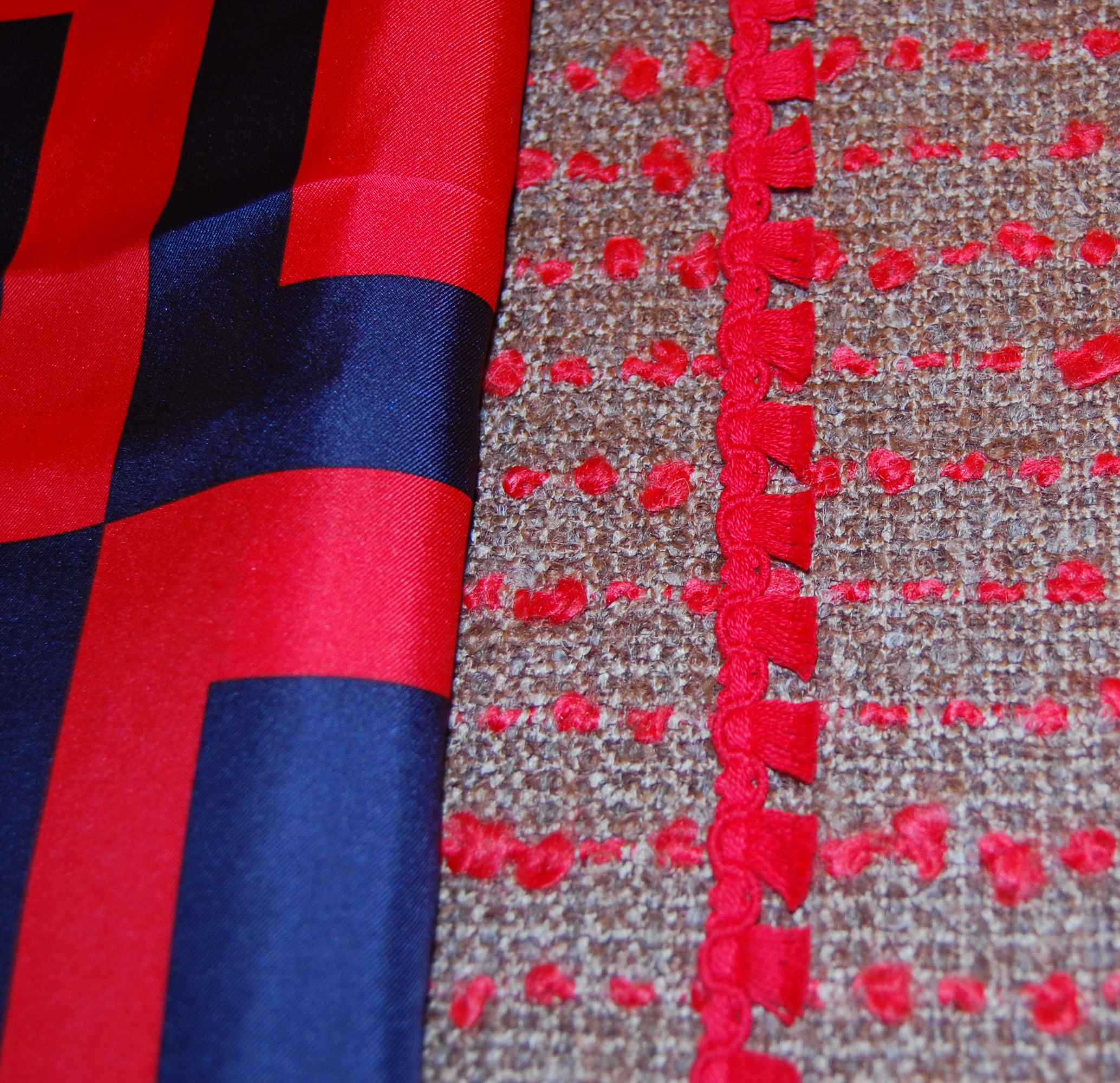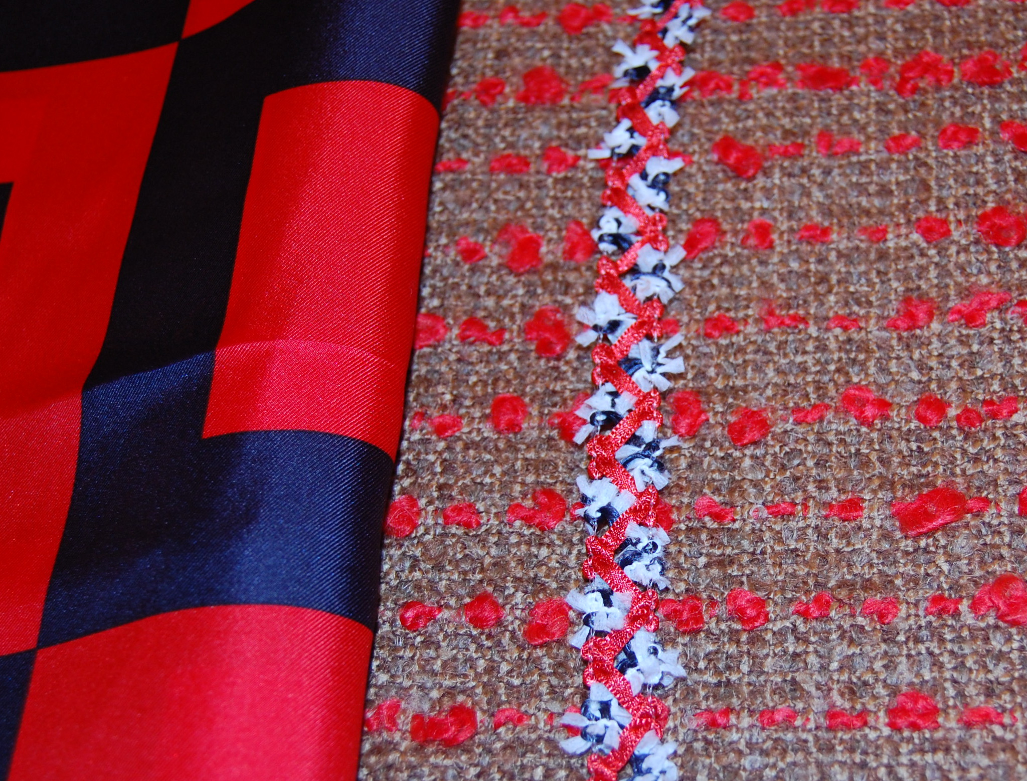 With fabrics in tow, I then headed up to the Buttons and Trims Department on the 3rd floor. An initial look at the red trims flummoxed me, as none of them seemed right. Then one of the wonderful assistants in the Department came to my rescue and found these two trims.