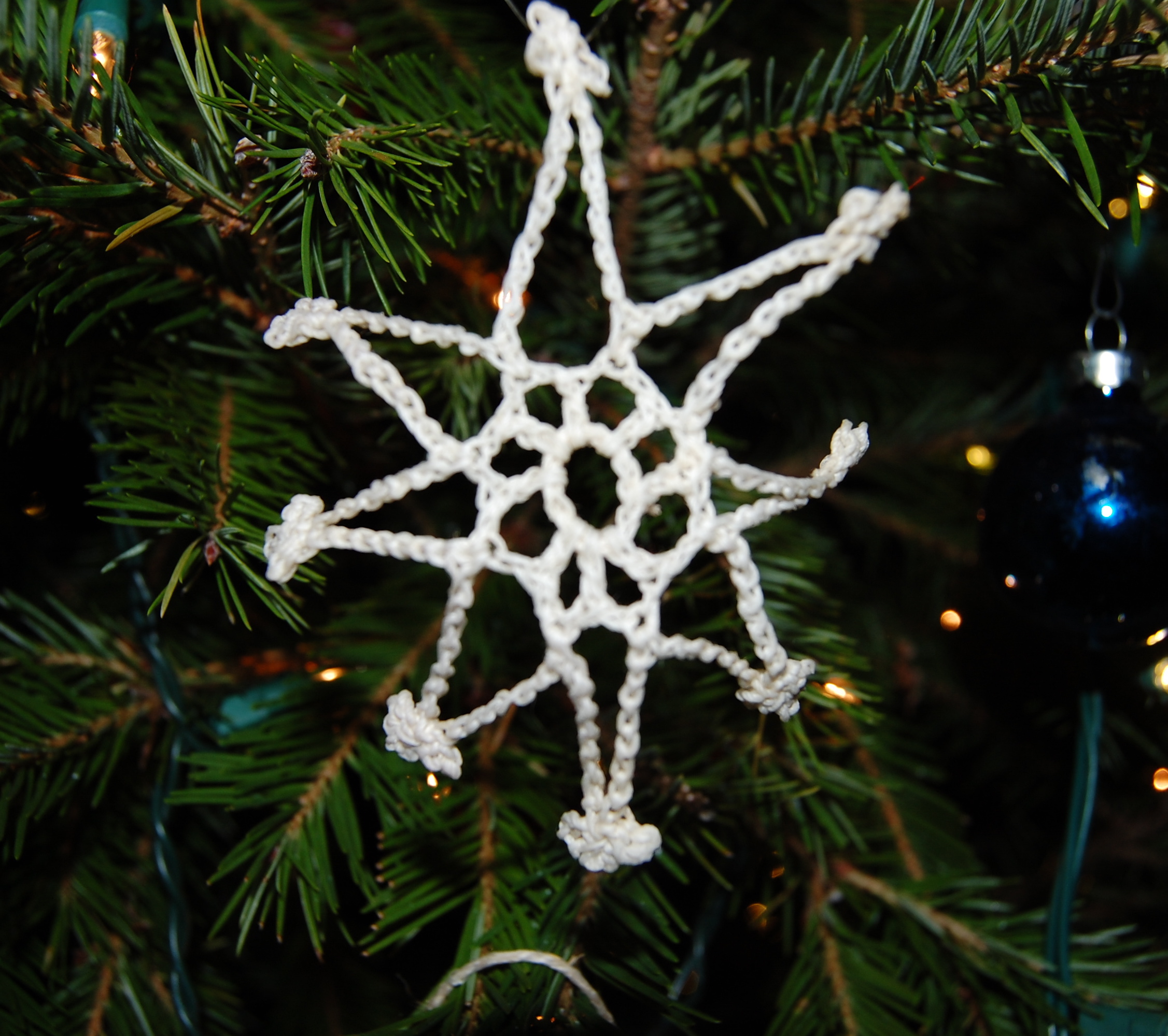 My sister crocheted fancy snowflake ornaments for us very early in my husband’s and my marriage. Those snowflakes are now yellowed and bent, but every year they go on our tree, where a certain little cat always finds them and somehow picks them off to chase around the house. No wonder they are a little tattered! Our tree would not be the same without them.