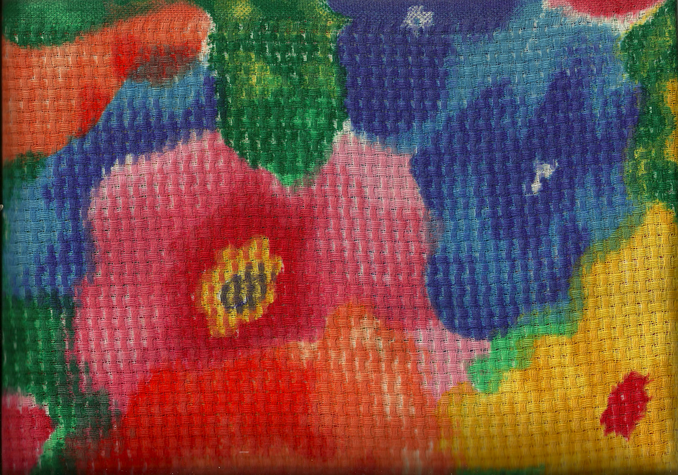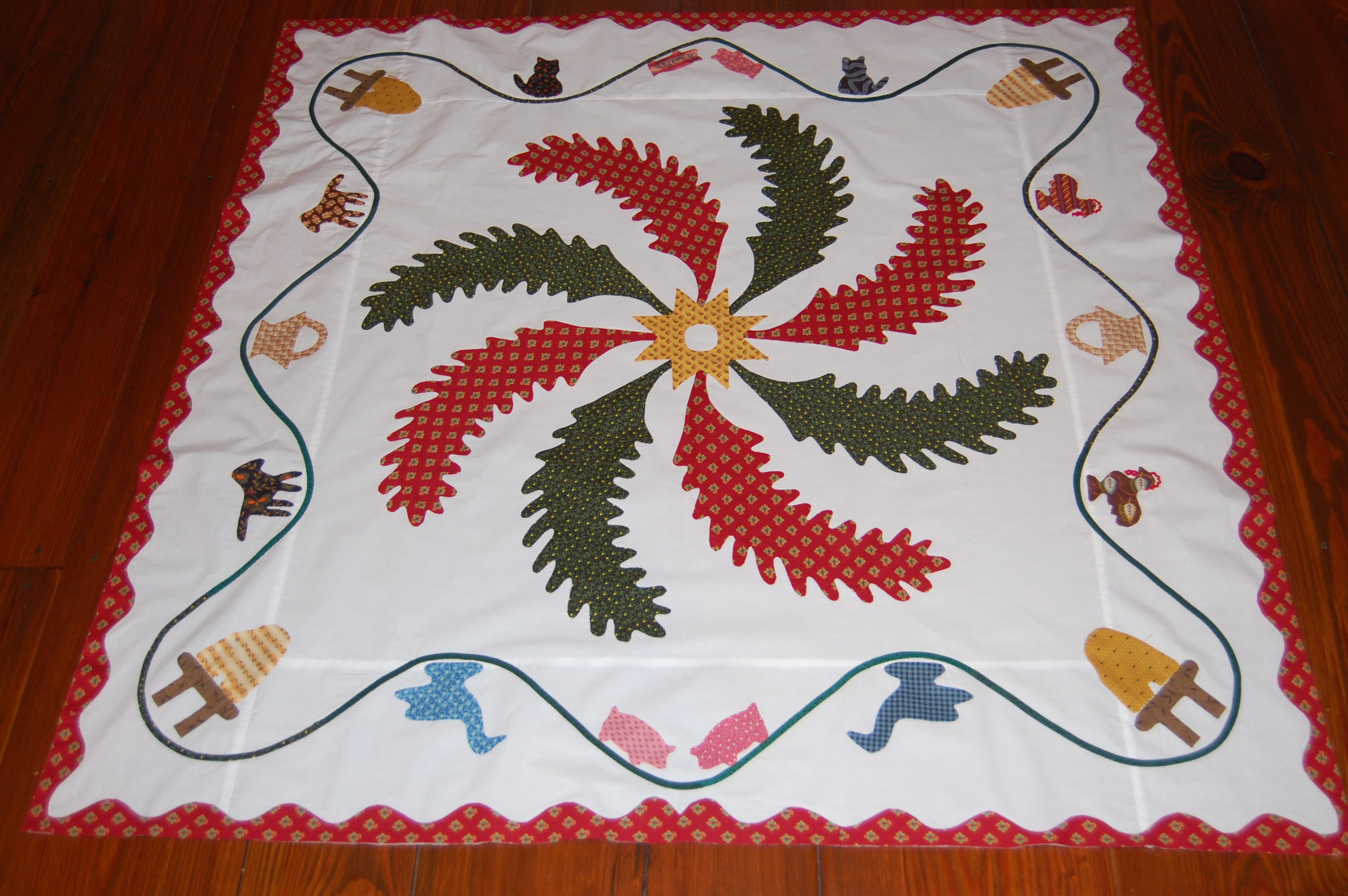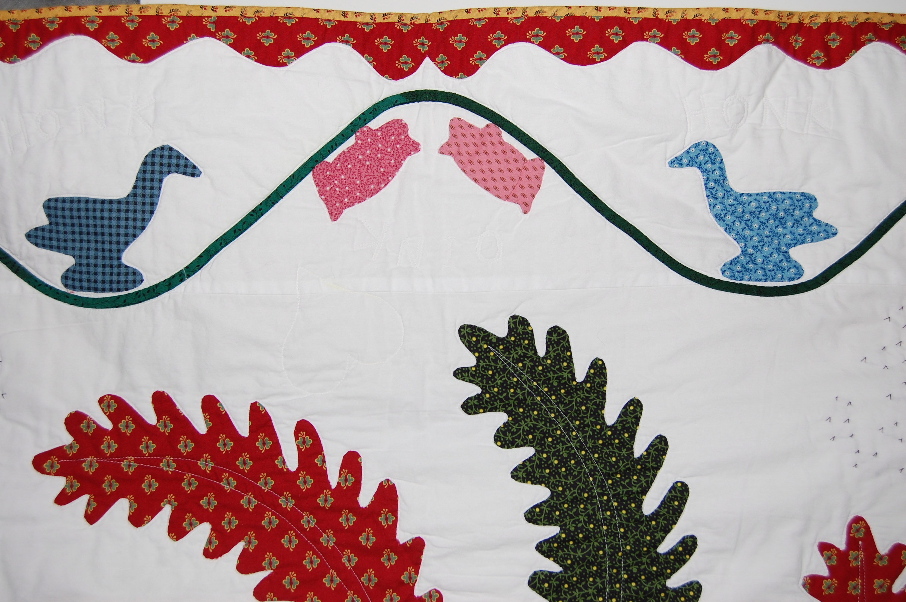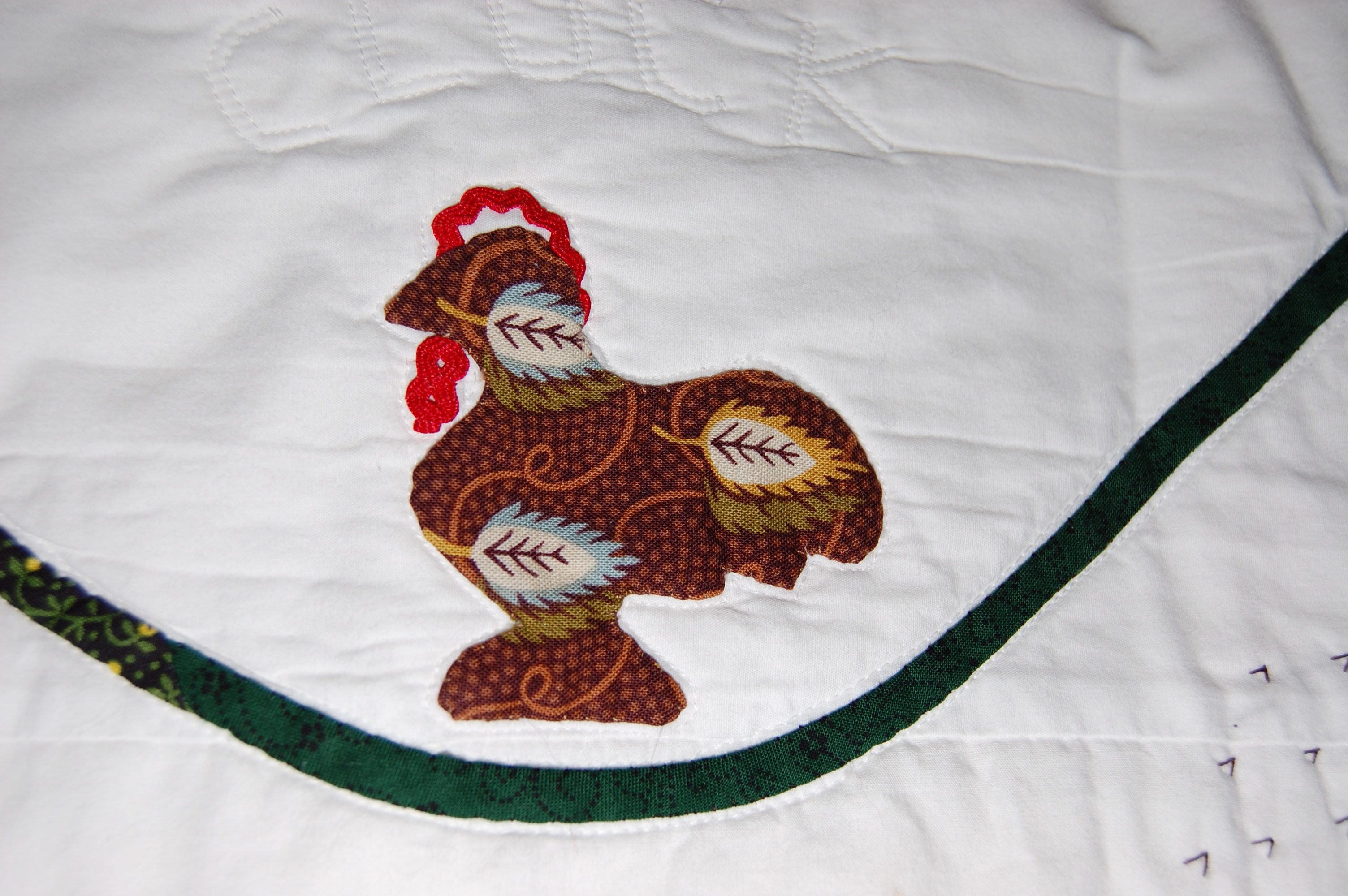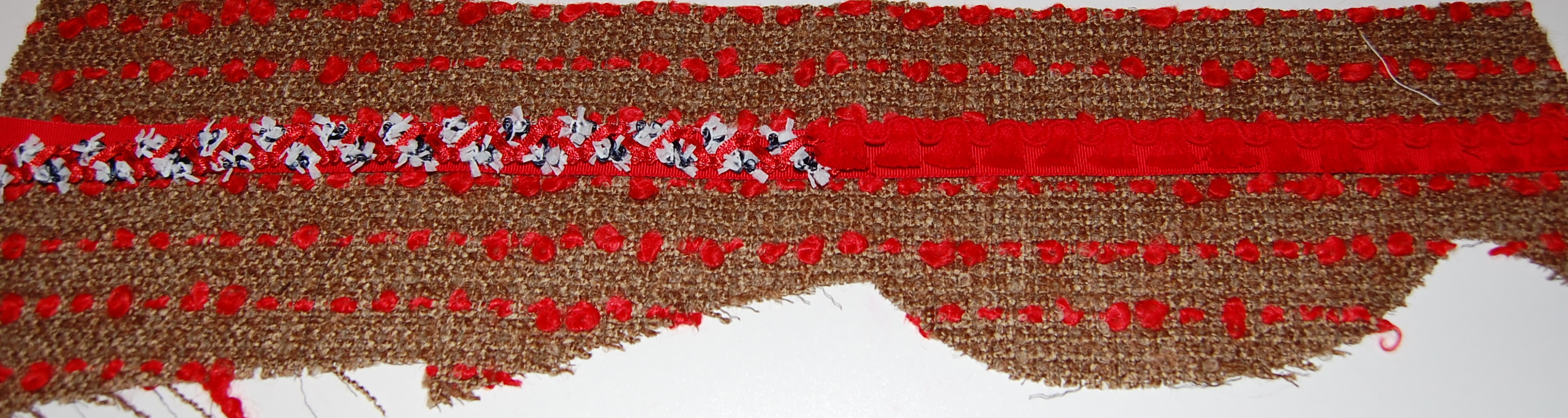 Here are the two trims I had chosen. I really liked the fact that the spacing on the multi-color trim matched exactly the spacing of the red rows on my fabric.
