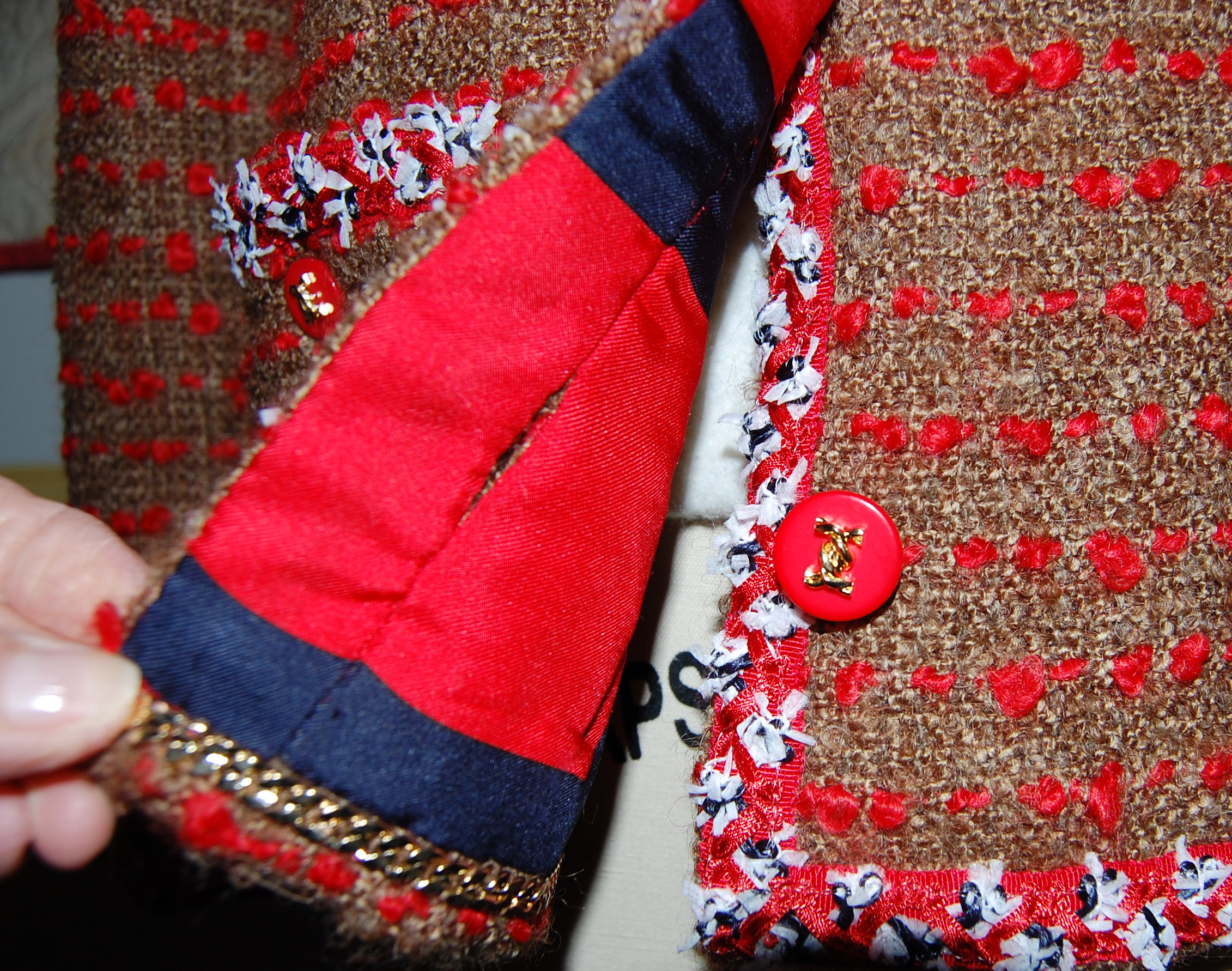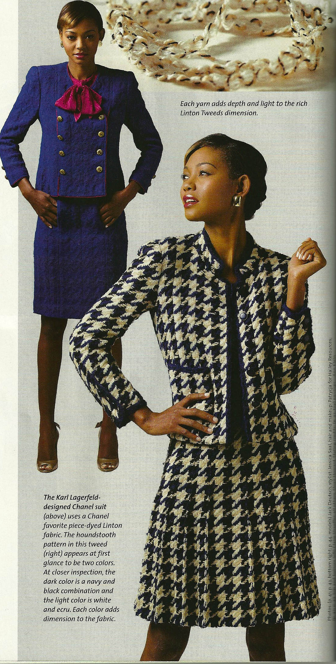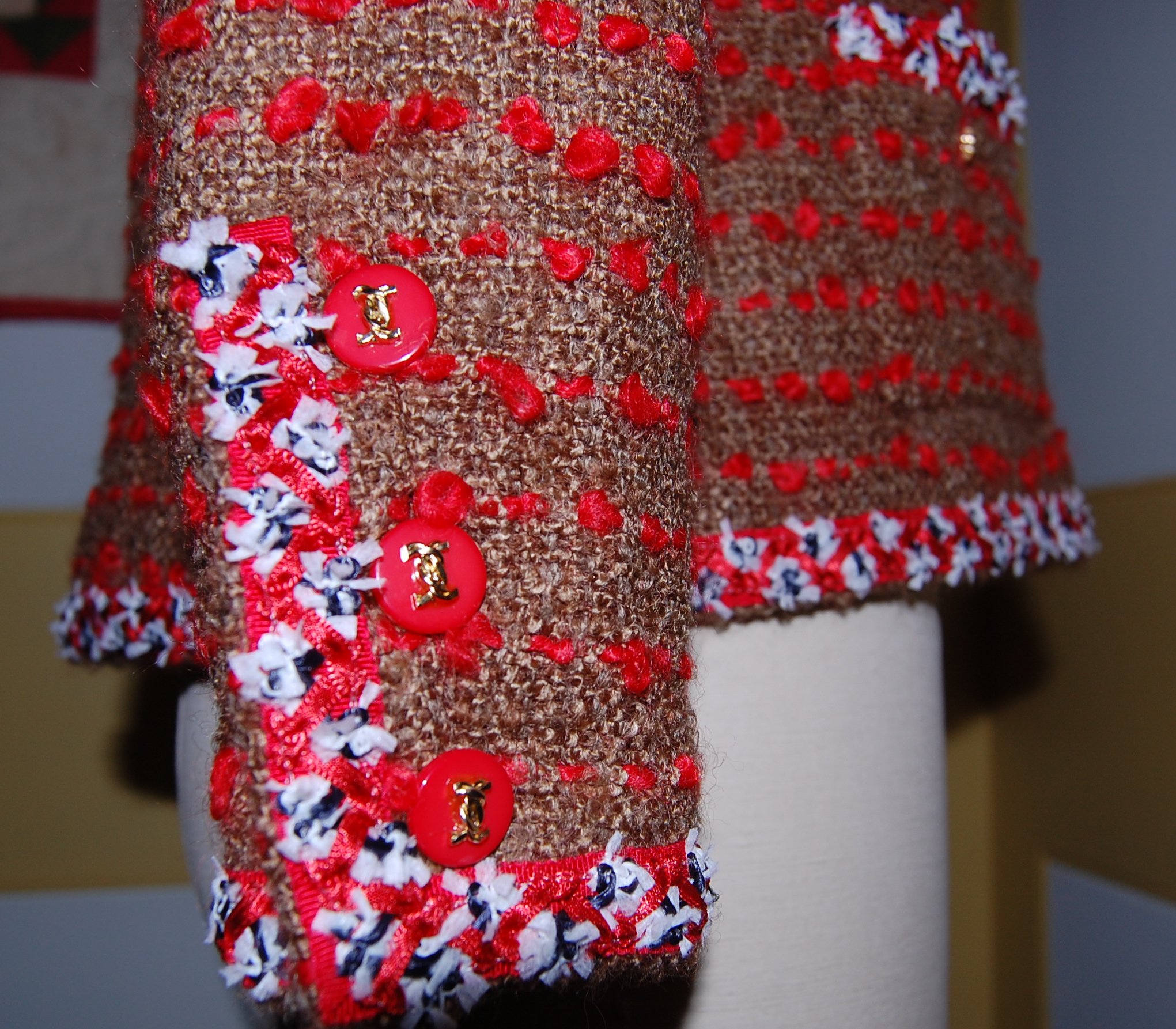 Because of the lining fabric I had chosen (and from which I am making a blouse), I was leaning towards the red, white and blue trim, but I thought it looked a little “weak”. What to do? I started looking at as many pictures of Chanel jackets as I could find, but the one that made the light bulb go off was one from that same issue of Threads Magazine: