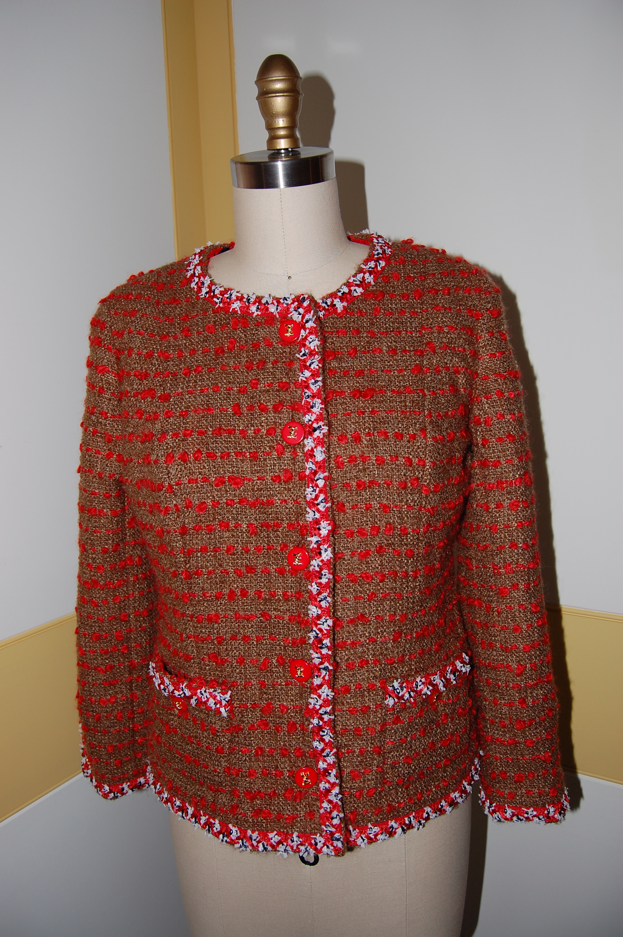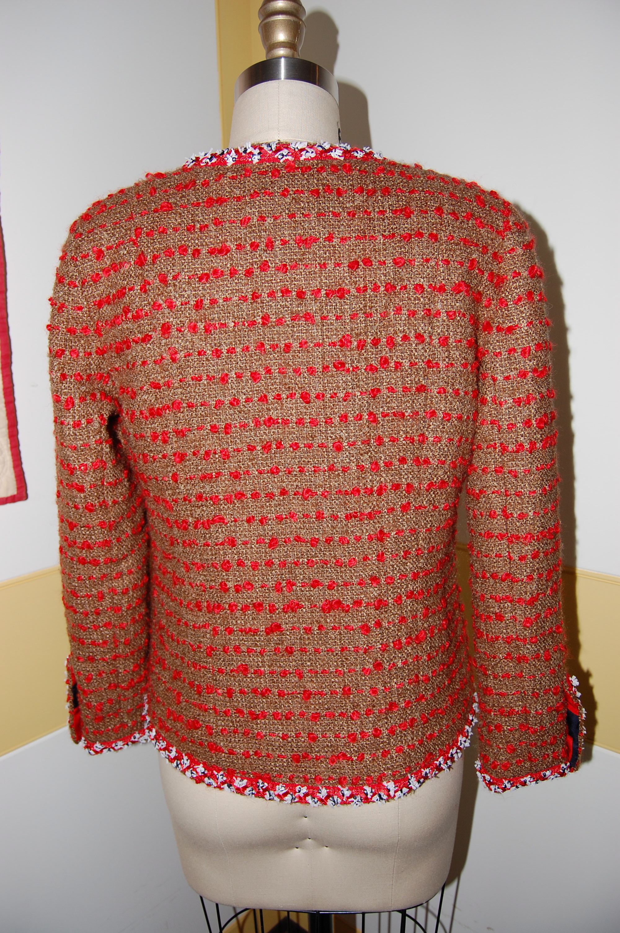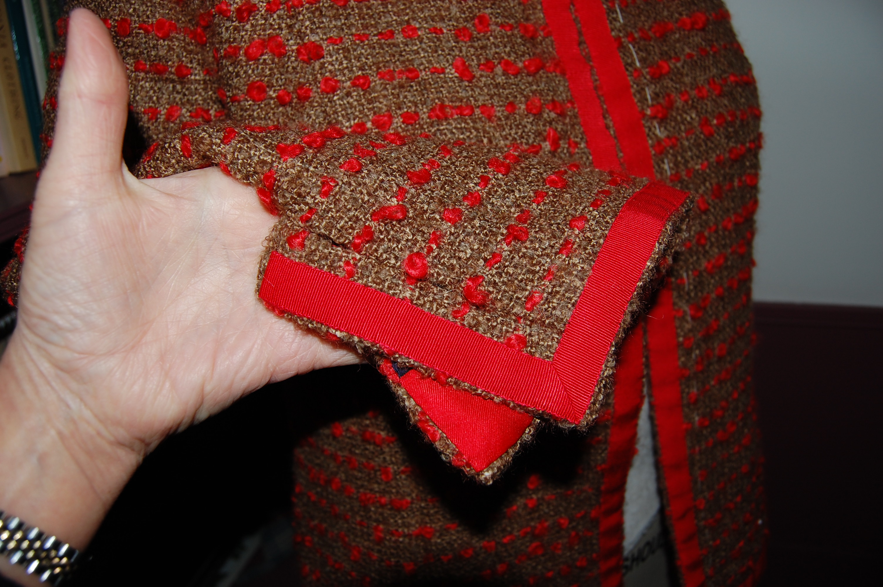 Because of the lining fabric I had chosen (and from which I am making a blouse), I was leaning towards the red, white and blue trim, but I thought it looked a little “weak”. What to do? I started looking at as many pictures of Chanel jackets as I could find, but the one that made the light bulb go off was one from that same issue of Threads Magazine: