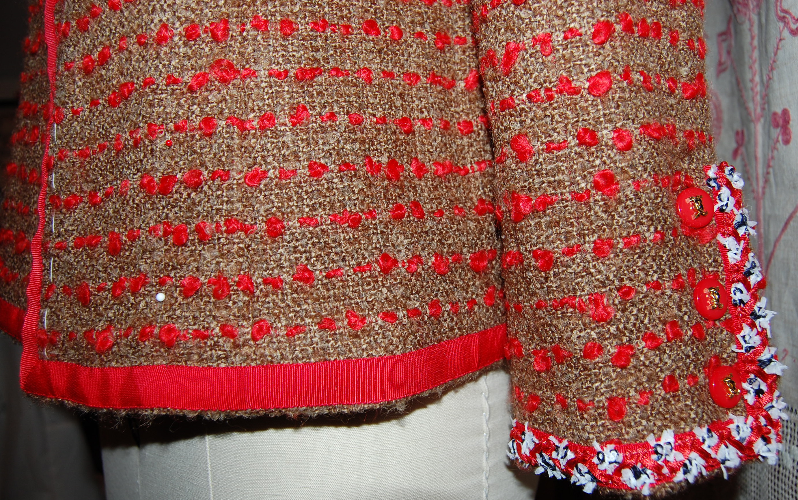 I took this picture to show the contrast between an all red trim and the multi-color one. I think the multi-color trim adds more interest to the jacket.