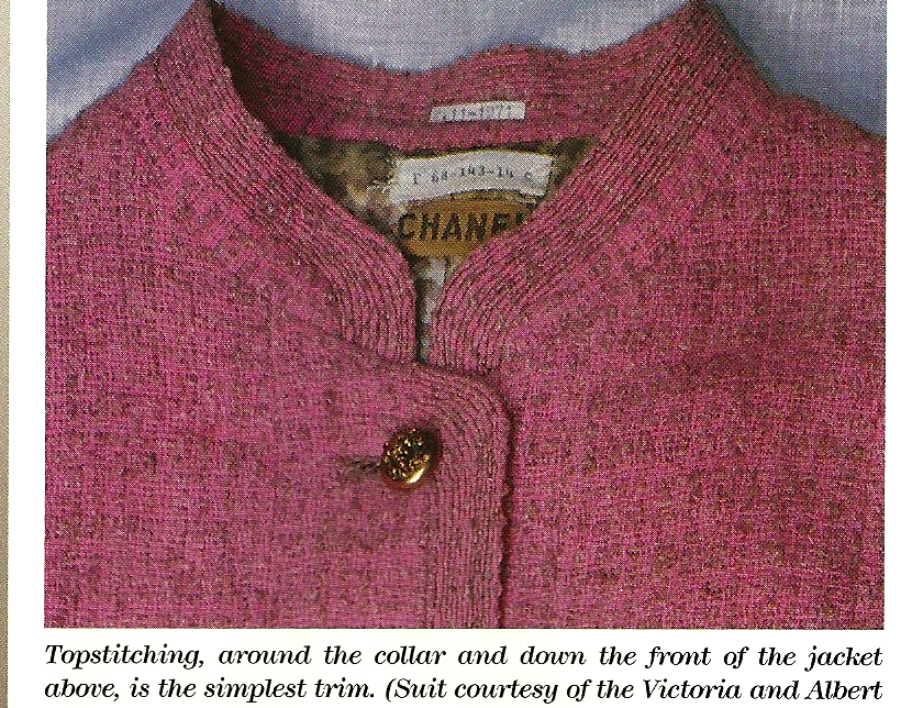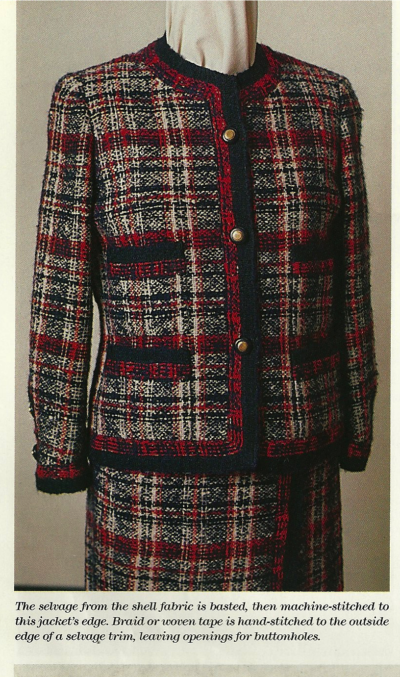 Fortunately, I have an issue of Threads Magazine from June/July 1989 in which Chanel jackets are featured. This picture gave me the idea for seam-slot buttonholes.