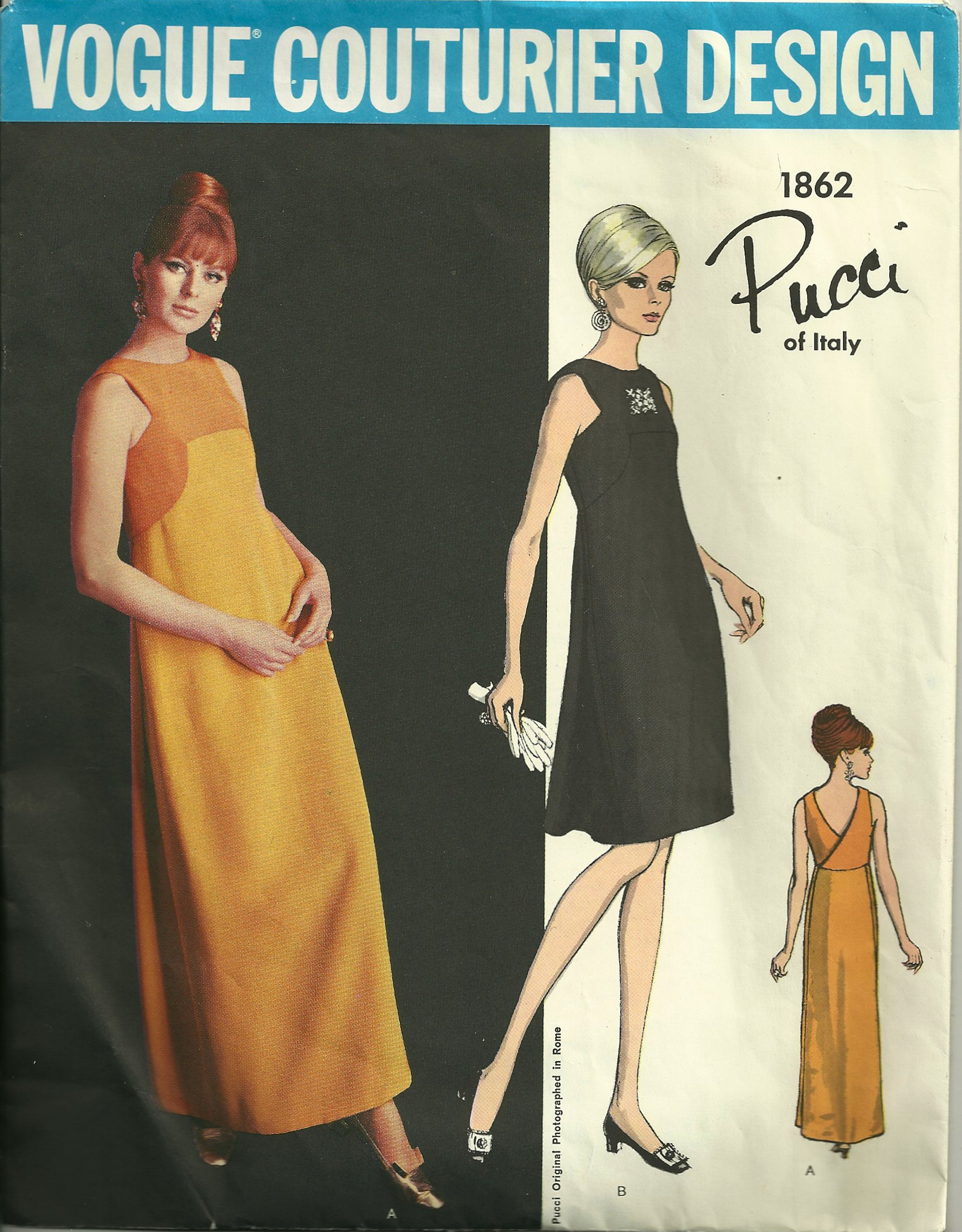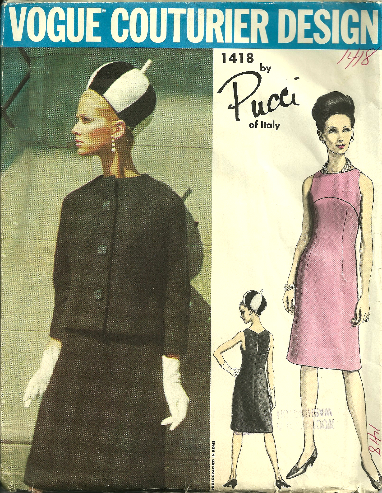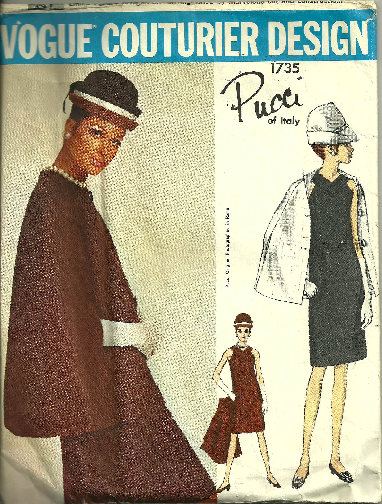 Shortly after this fabric purchase, I began to get a greater and new appreciation for Pucci’s diversity as a fashion designer as I acquired a few of his Vogue Designer patterns. Instead of featuring styles dependent upon his bright and unusual fabric designs, they showed feminine dresses and jackets, with clean lines and a surprising touch of demureness. Here are the three patterns I purchased: