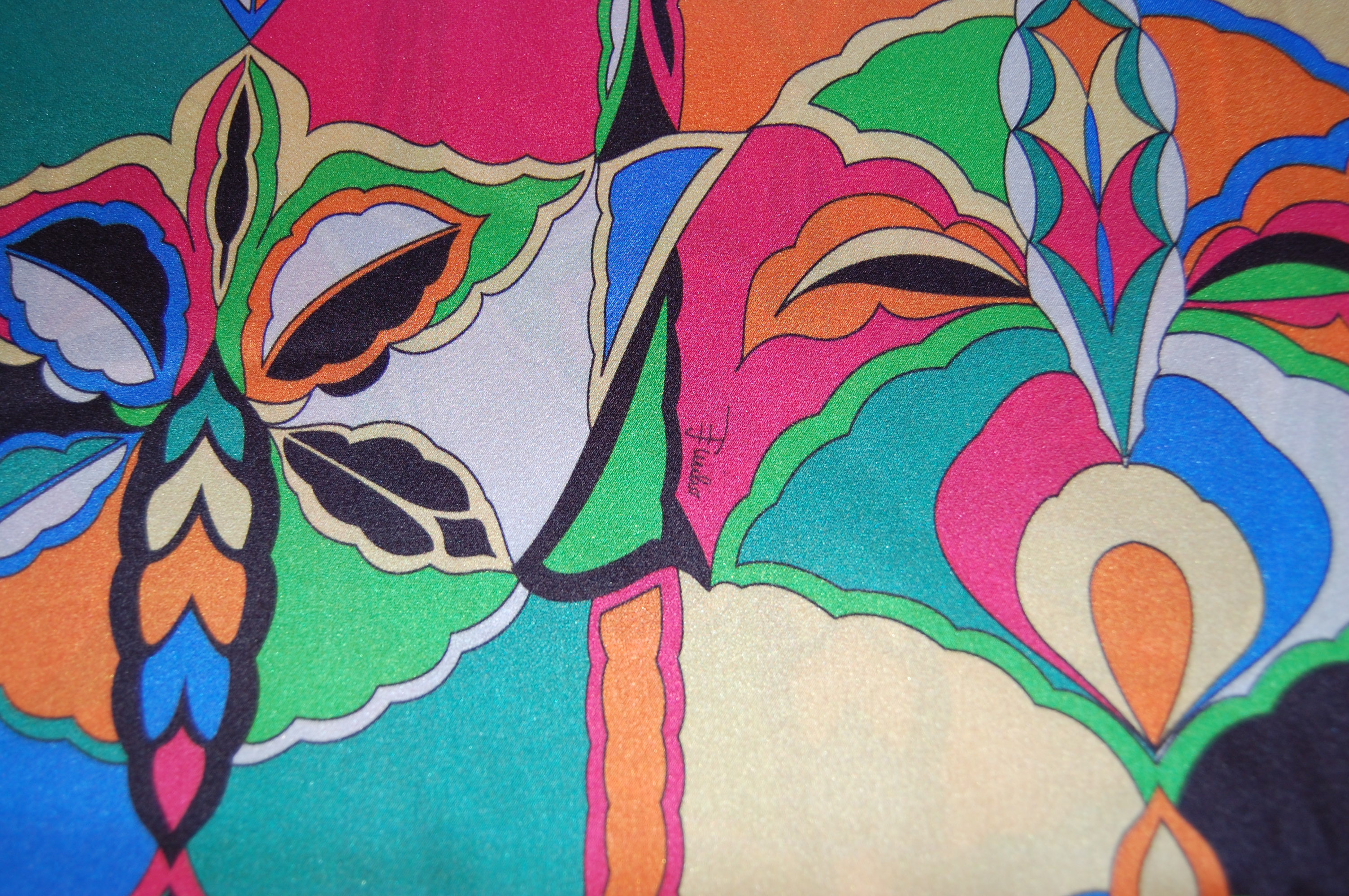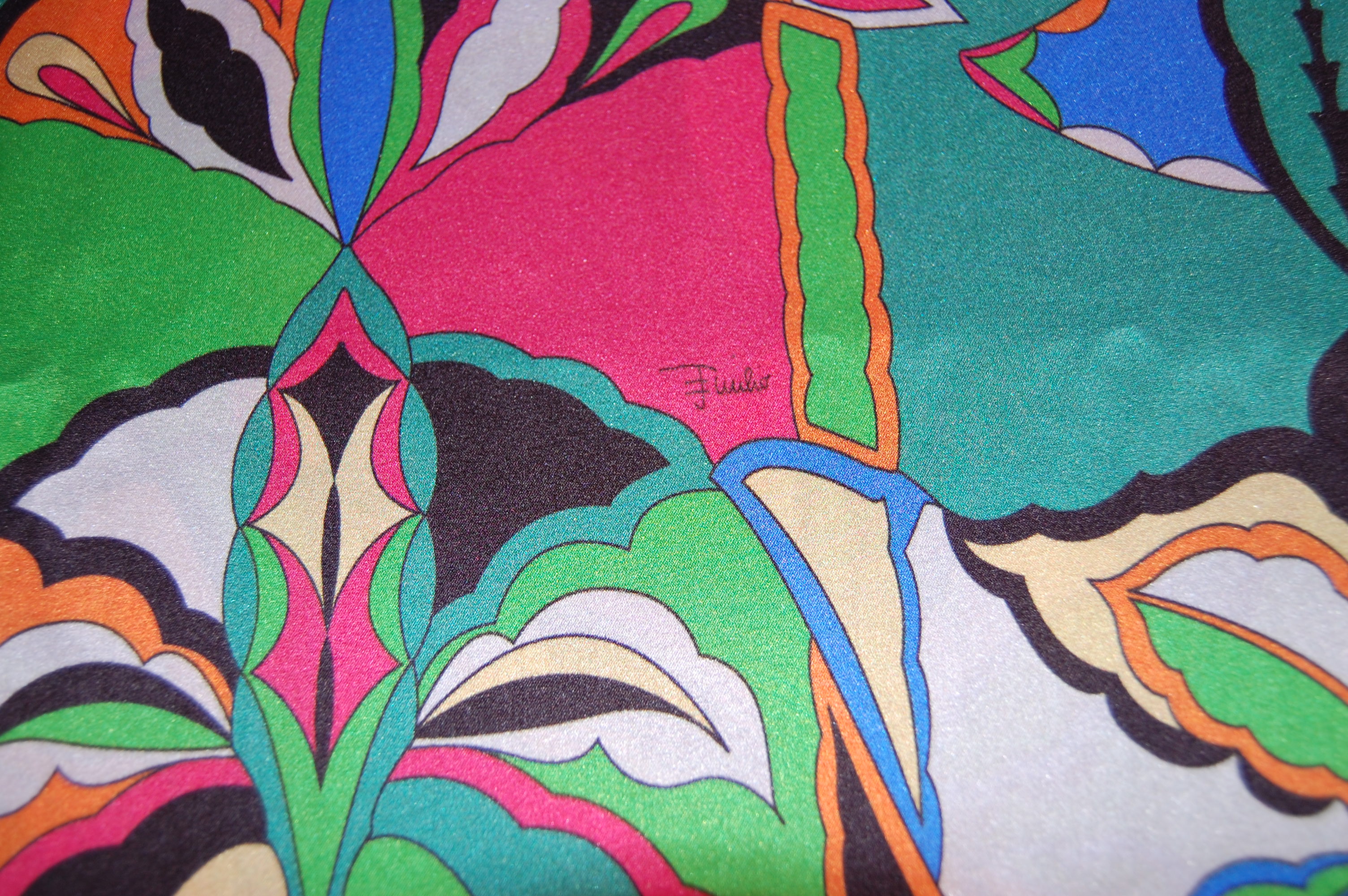 The silk I purchased seemed to have all the bells and whistles of a classic Pucci print. (Pucci’s daughter, Laudomia took over the business after her father’s death, and has continued her father’s signature style.) He only used the finest, luscious fabrics with a color palette “straight from the Aegean horizon” according to the entry on him in The St. James Fashion Encyclopedia ( Visible Ink Press, Detroit, MI, 1997, pages 325-326): “turquoise and ultramarine set against sea green and lime, or hot fuchsia and sunflower yellow”. These colors are arranged in “optical fantasies of geometric shapes” which eschew repetitiveness. And, finally, every authentic Pucci fabric carries his discreet “Emilio” signature. (The Vintage Traveler blog has an excellent post on Pucci and his sporty prints, which shows another example of his signature and his diverse designs.)