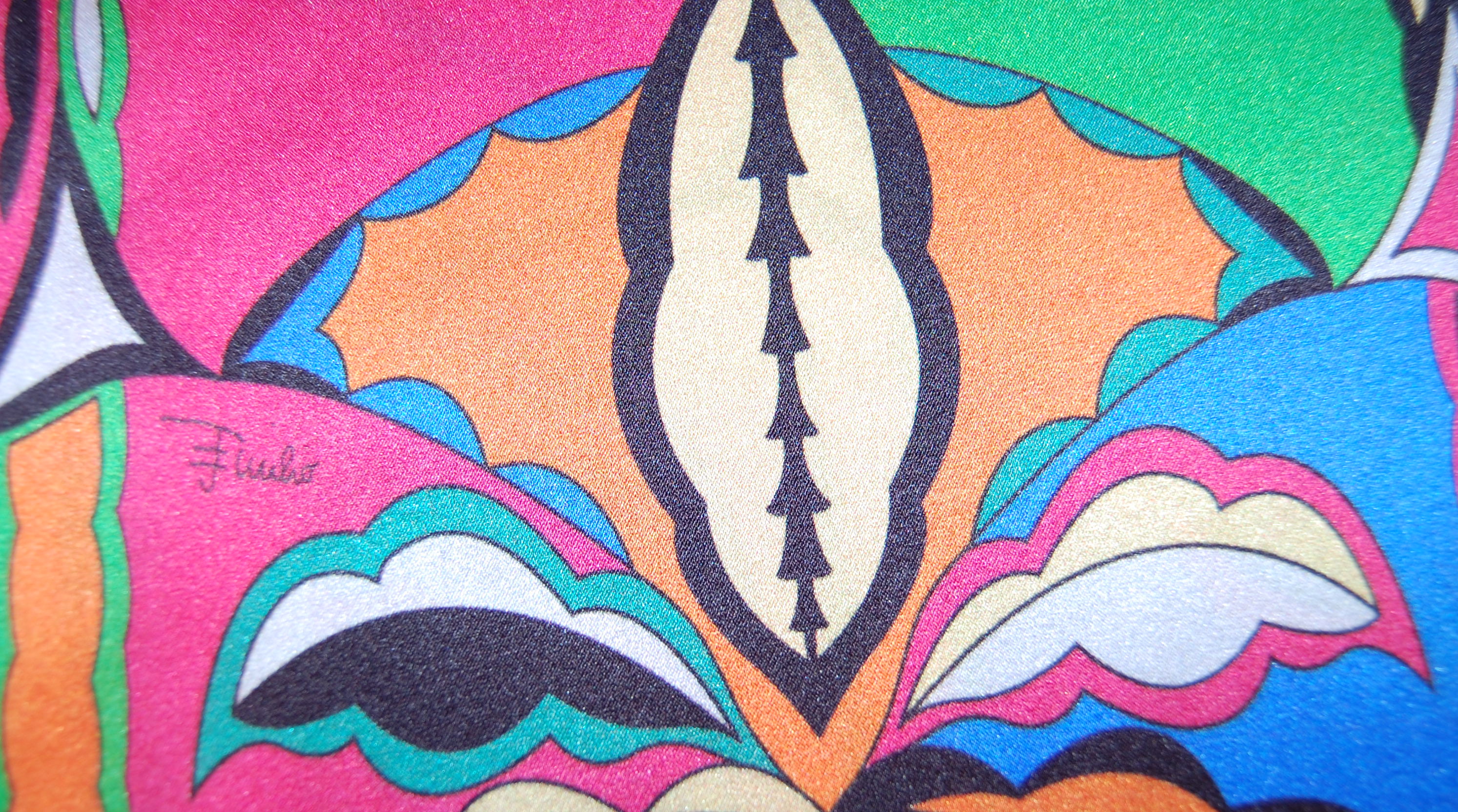 Lately I’ve been thinking about Emilio Pucci (1914-1992) a lot. It all started a couple of years ago on one of my West Coast visits to Britex Fabrics in San Francisco. I had already decided upon several lengths of fabric, when I saw a silk charmeuse, which clearly spoke to me of Pucci. The design was so amazing, the colors so vibrant, and the silk so luscious, that, with a little encouragement from my husband, I added it to my pile. At 60” wide, I thought 2 yards would suffice for a blouse, not really knowing what I would make.