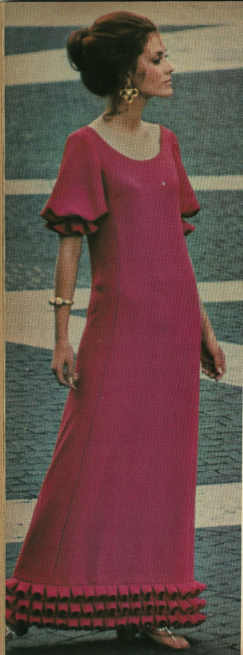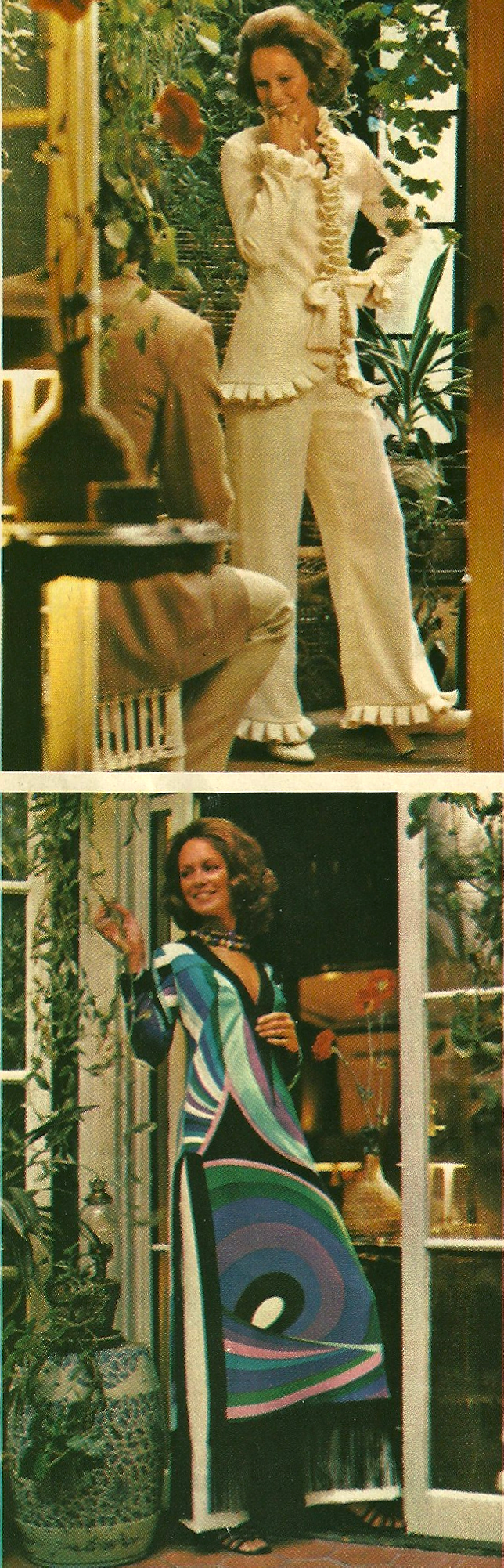 The caption in this June/July 1972 article says: “Emilio Pucci adds glamour to your life with an off-white silk crepe pantsuit…” while the lower picture shows his “signature colors on a silk jersey lounge gown.”