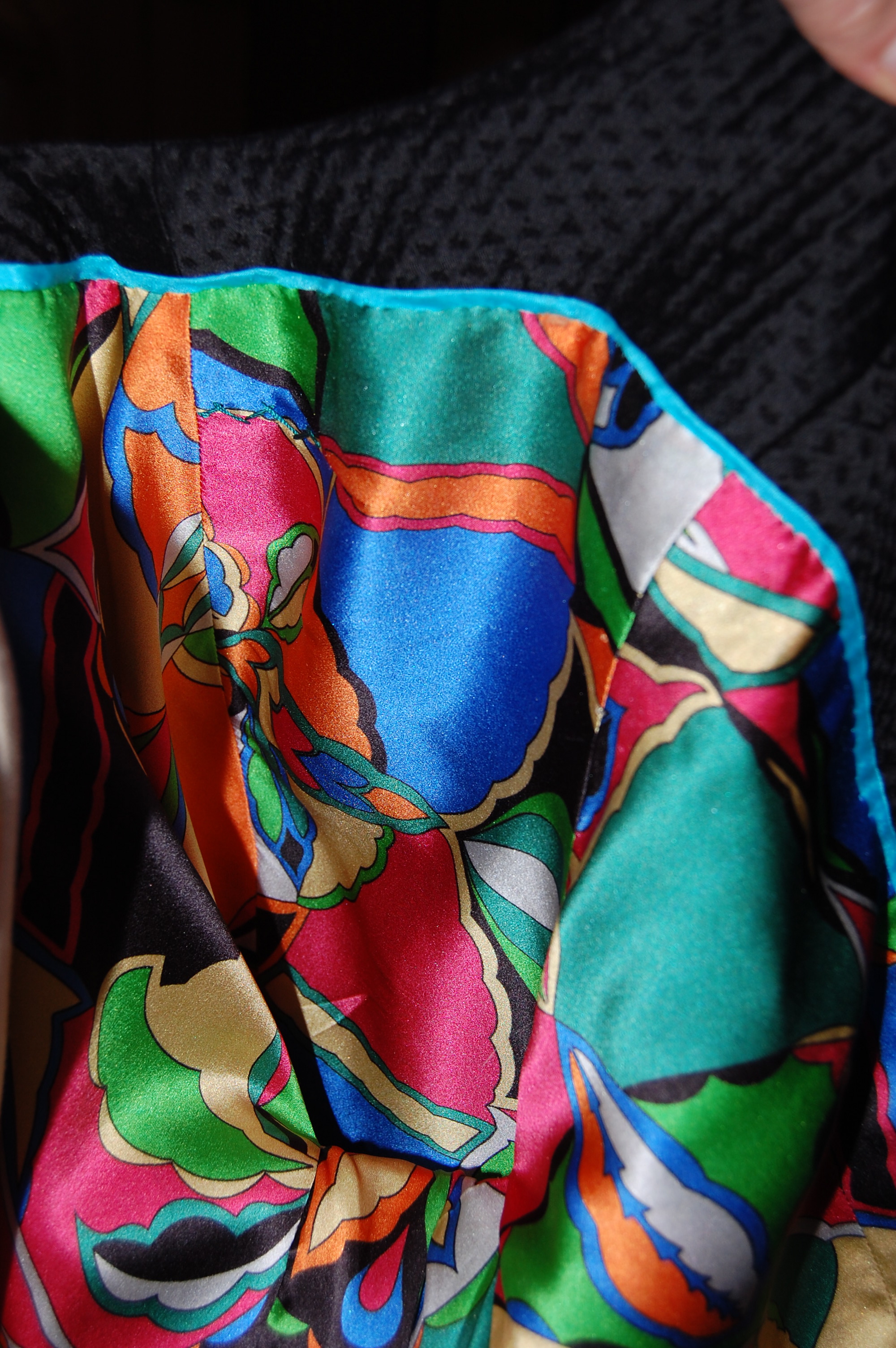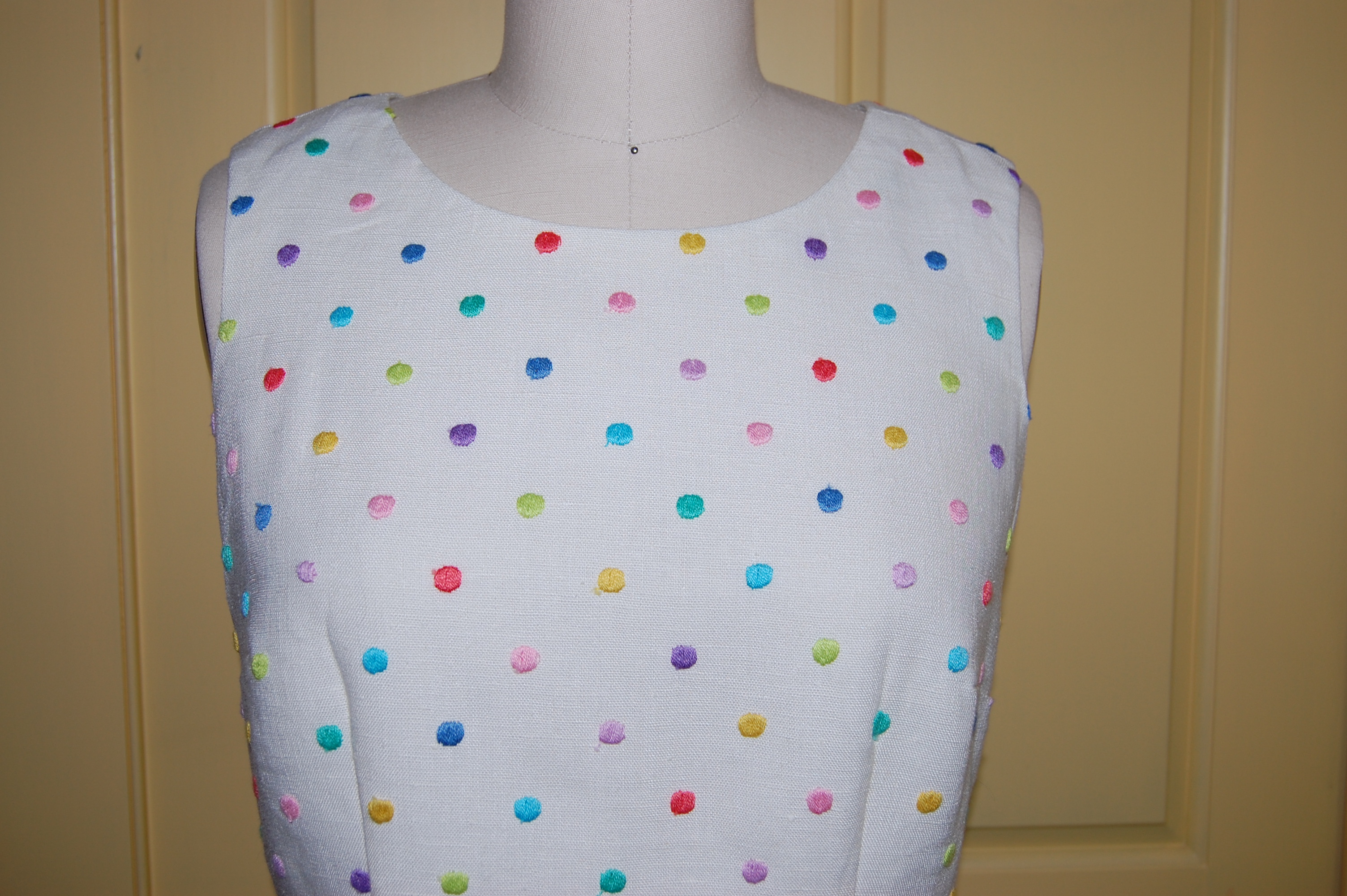I decided to make the lining entirely separate and then attach it to the dress at the neck, armholes, zipper and back hem slit using a fell stitch. However, once I had my seam allowance folded back at the neck and armholes, I noticed a little bit of “shadowing through” of some of the colored dots along those edges.