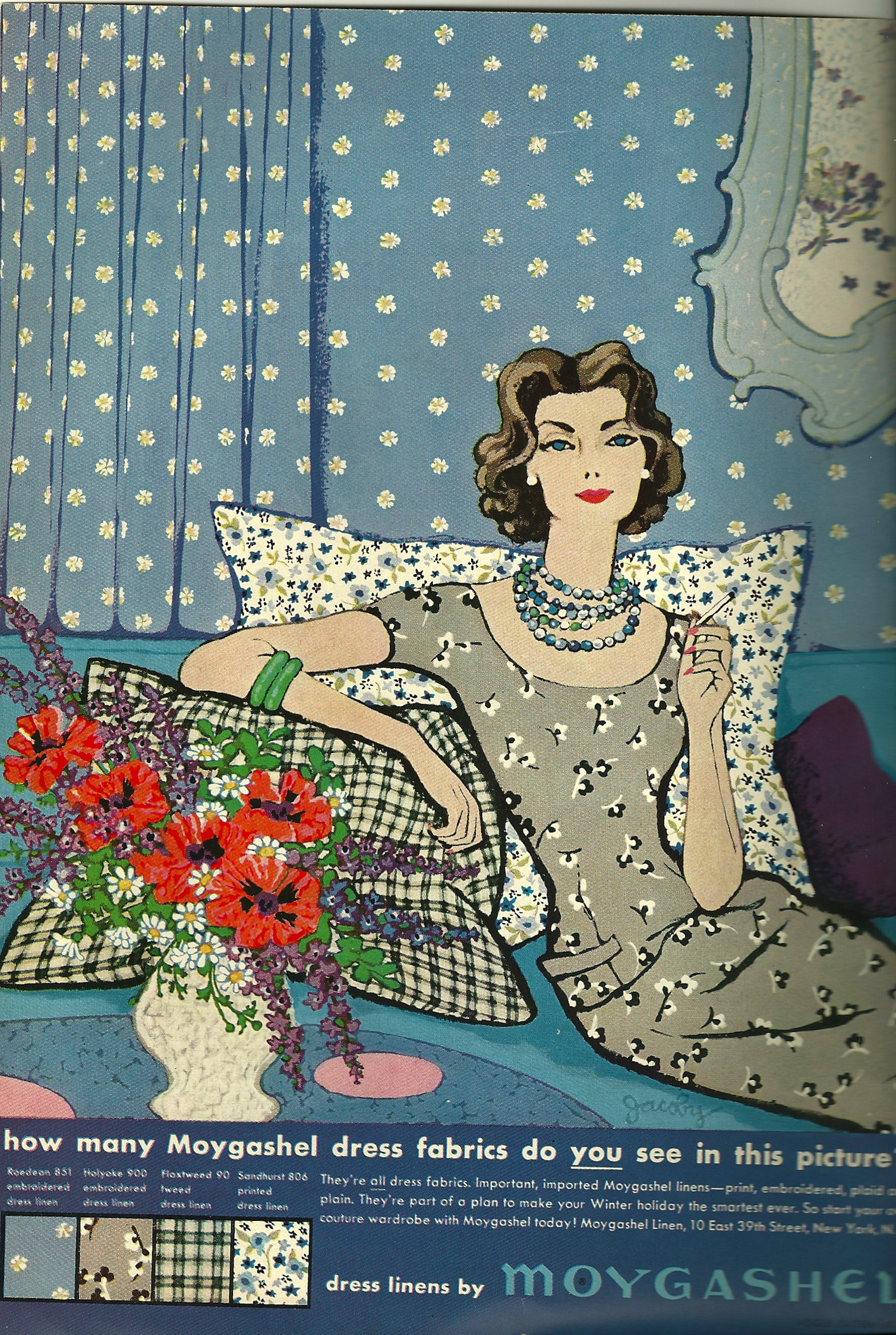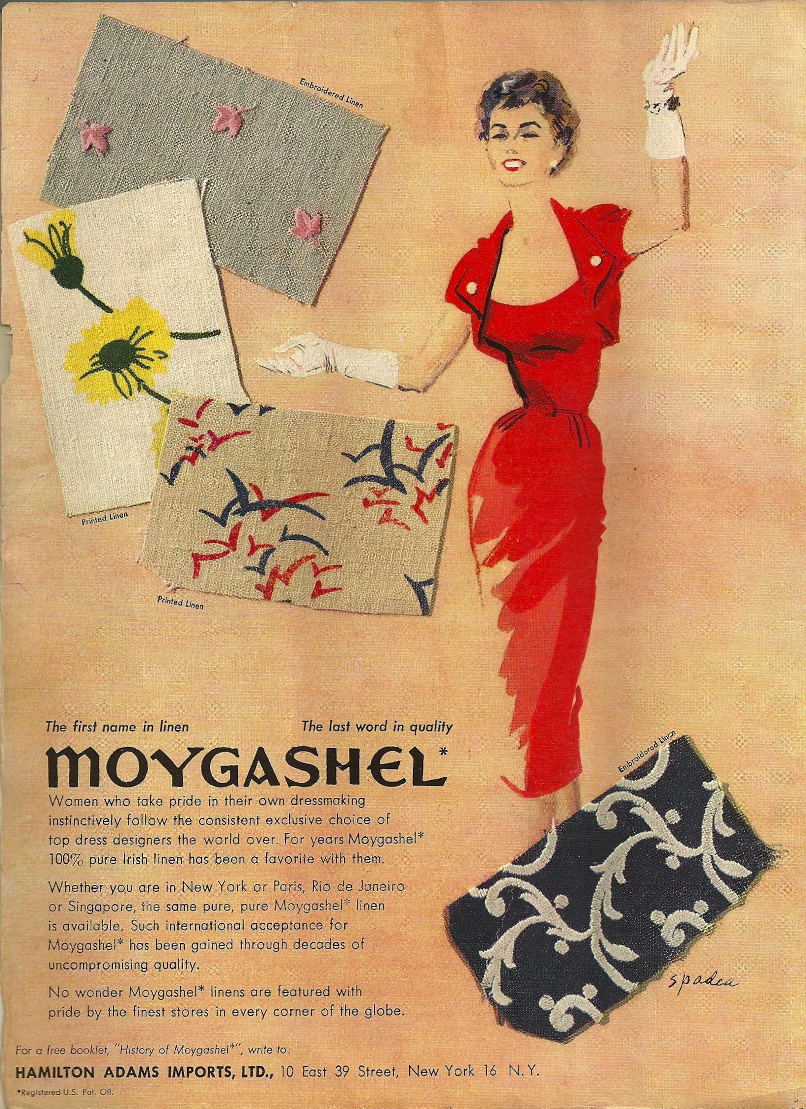 When I purchased this vintage linen fabric online, all I had was a photo or two. There was no selvedge marking, no attached label, no sales receipt to give any clue to its origin. However, the photos were clear, the weave of the fabric was visible enough, that I felt fairly confident that I was looking at a mid-century Moygashel linen. At 36” wide, I knew from experience it was prior to 1960. I also knew that Moygashel produced many embroidered dress linens in the 1950s. Here are two Moygashel linen ads which show both printed and embroidered linens: