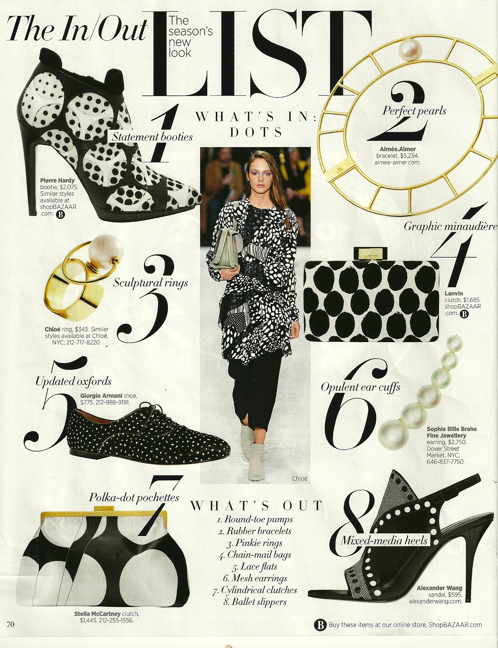 I freely admit to being nostalgic about polka dots. I have always loved them. And I have always been drawn to fabrics and fashions featuring dots, whether they be large, jumbo, small, tiny, or medium. In my fashion lexicon, they are never out of style, but it is always particularly rewarding to see dots featured as “fashion forward” – as in the July 2014 Harpers Bazaar.
