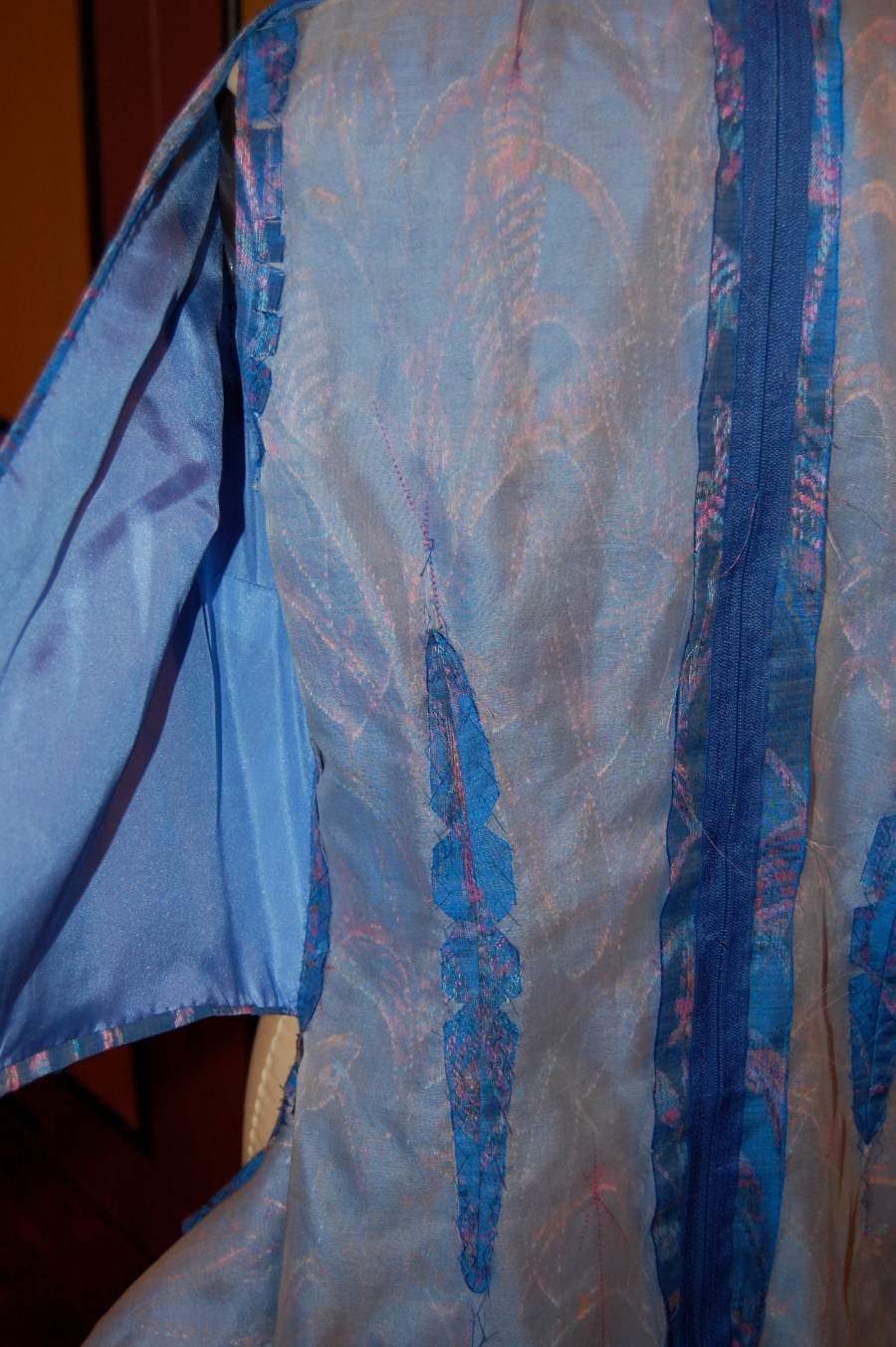 The front overblouse sections are attached to the side seams, but the front underdress is hanging loose, which does not show in this photo.