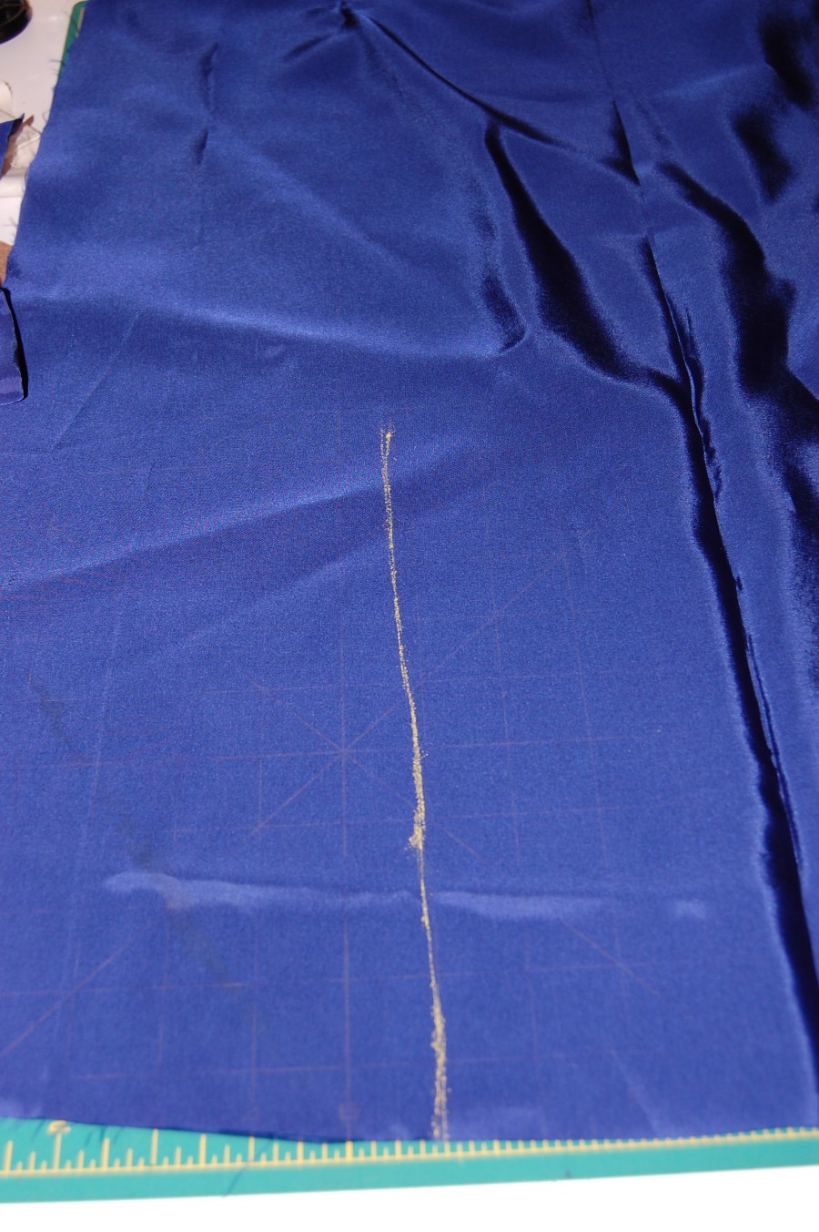 First I marked where I wanted the pleat in the lining to be. By the way, the lining is Bemberg rayon. I usually like to use crepe de cine for my linings, but I had this Bemberg in the right color, so I decided to use it.