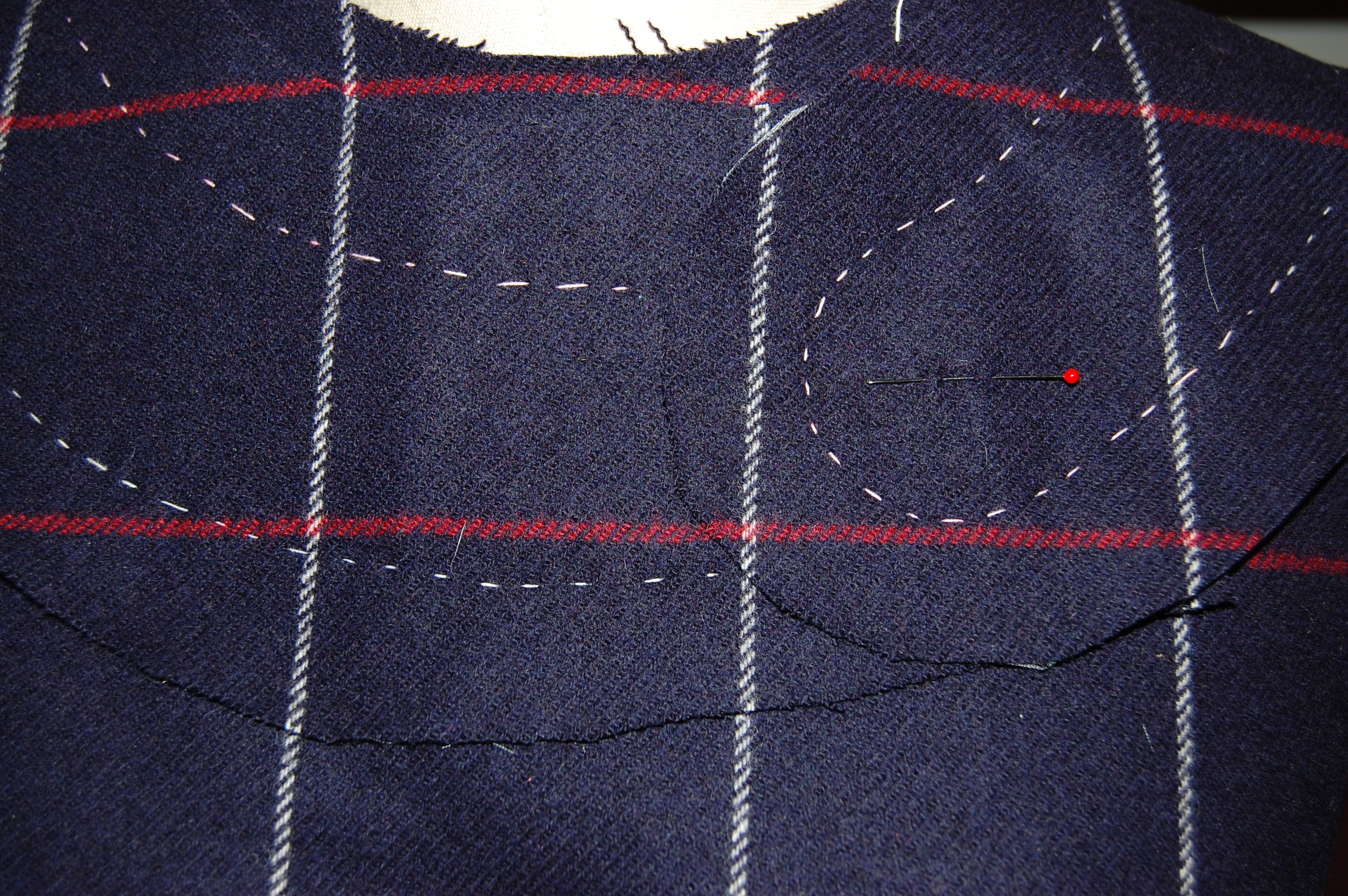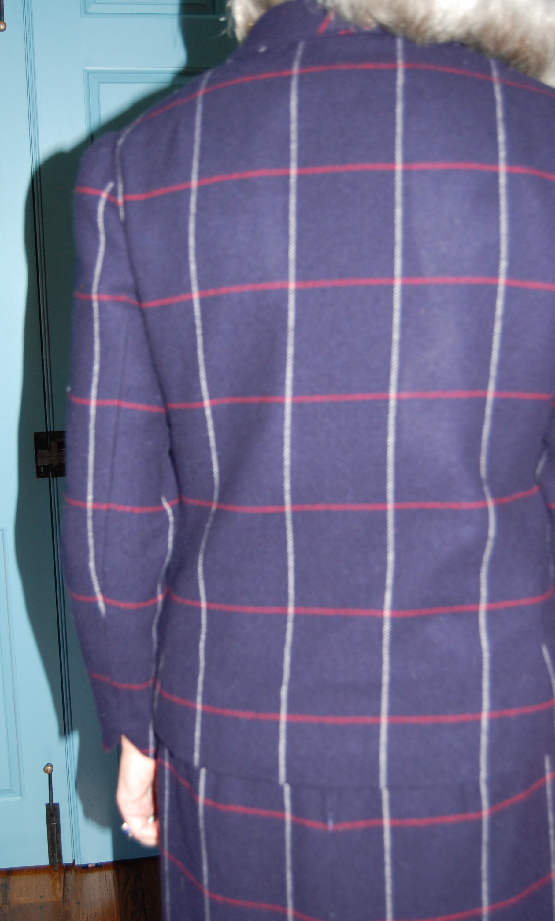 When I fell off the edge of the world after Part 4 (only figuratively, thank goodness!), I was starting on the sheath dress. I had decided to add a collar to it, so that I could use that fourth vintage button (I had already used three on the jacket itself). Matching the windowpane plaid on the collar section took some special attention, as this photo shows: