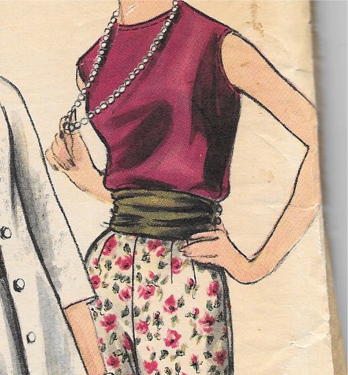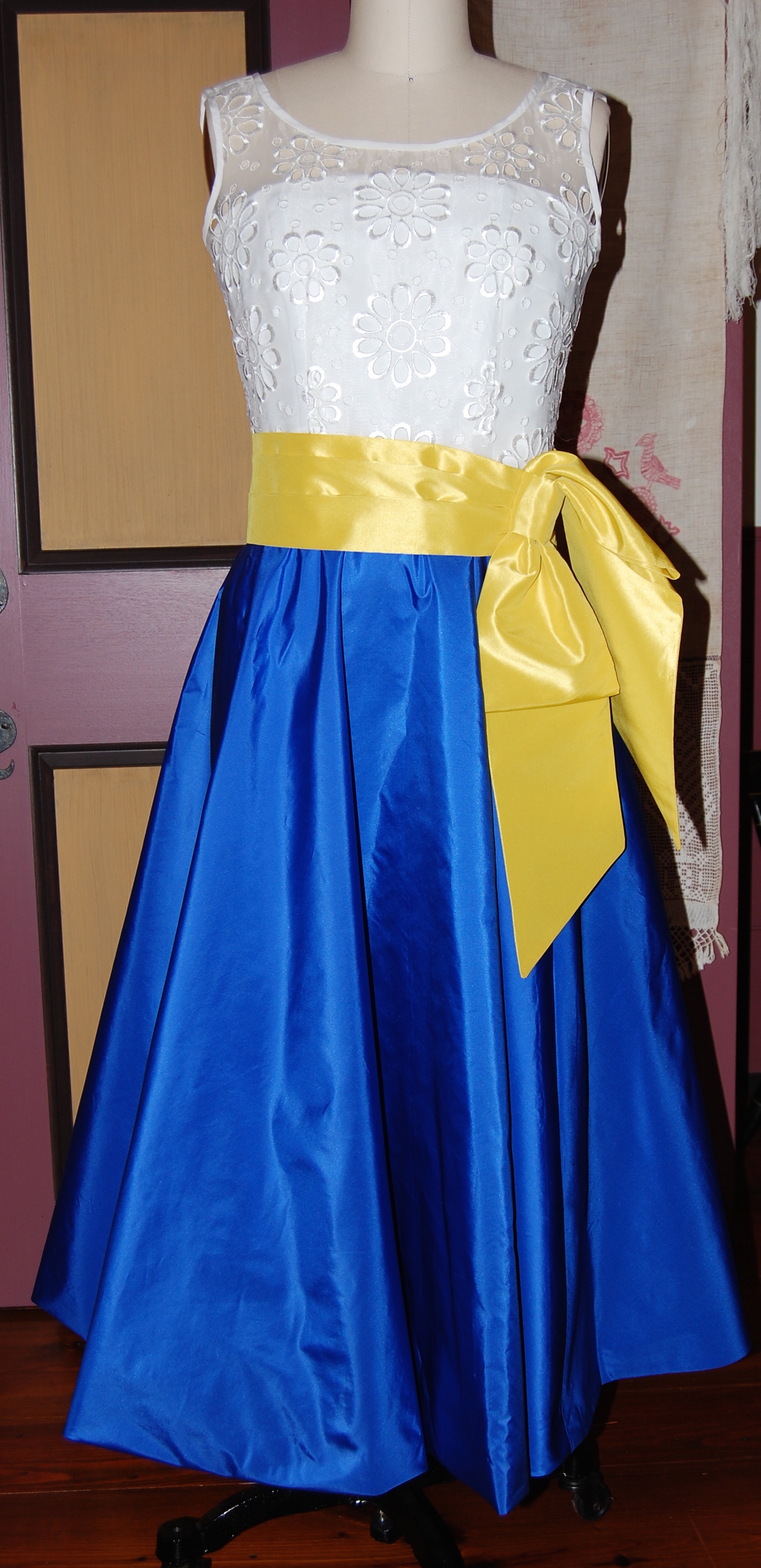 When the yellow silk taffeta arrived, I knew the decision was the right one. All I had to do then was figure out how to make the sash. Easy, right? With lots of time to think about this while I finished the embroidered organza top and the sapphire blue skirt – and the dress lining – I gradually came up with a plan. I decided a more structured cummerbund and bow would be the best look. First I went in search of a cummerbund pattern, which I found in an early 1960s pattern in my collection: