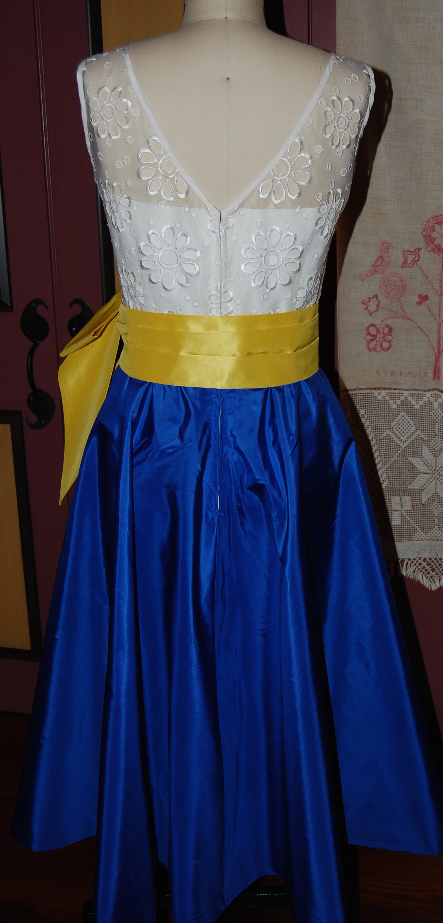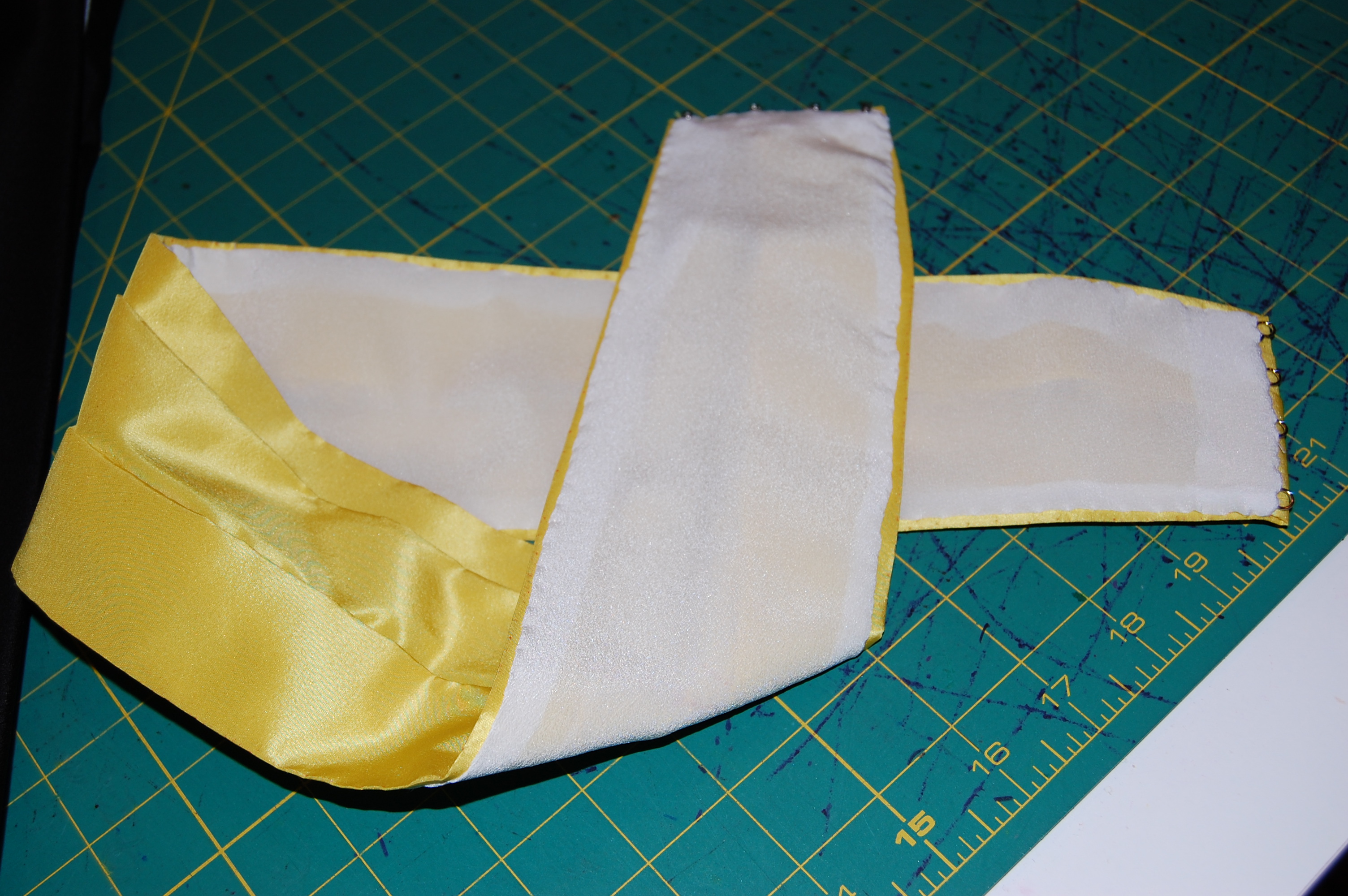 I increased the width and length a bit, as I knew it would need to be a focal point of the dress. I attached the bow to one end of the cummerbund, and used a snap to secure it in place on the other end.