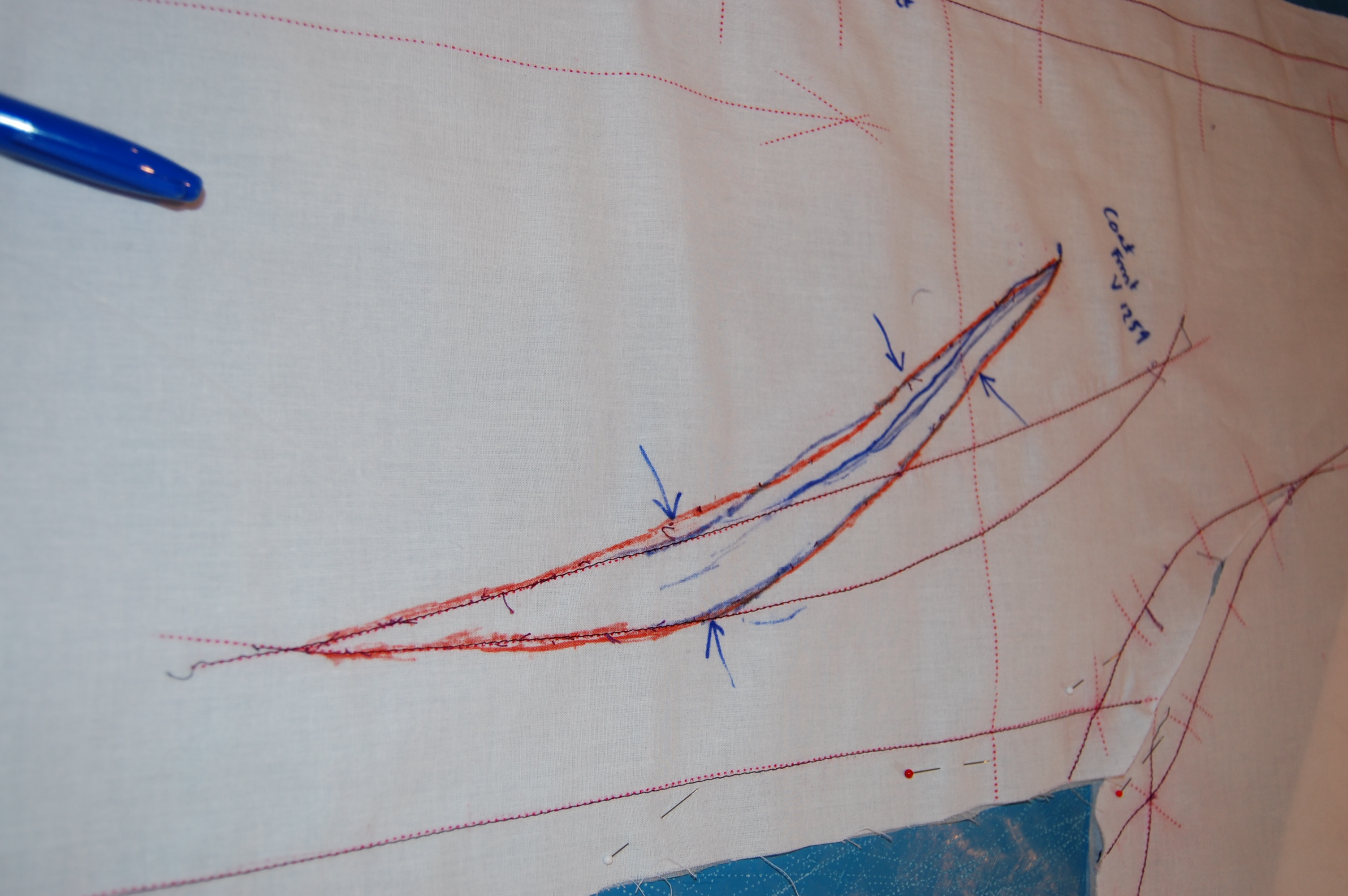 Now that I had a workable pattern, I knew I could just eke out the coat if I “pieced” the left front facing. I could live with that! And, just as important, I would have enough of the fabric to cut bias strips for piping for my daisy sheath. Whew!