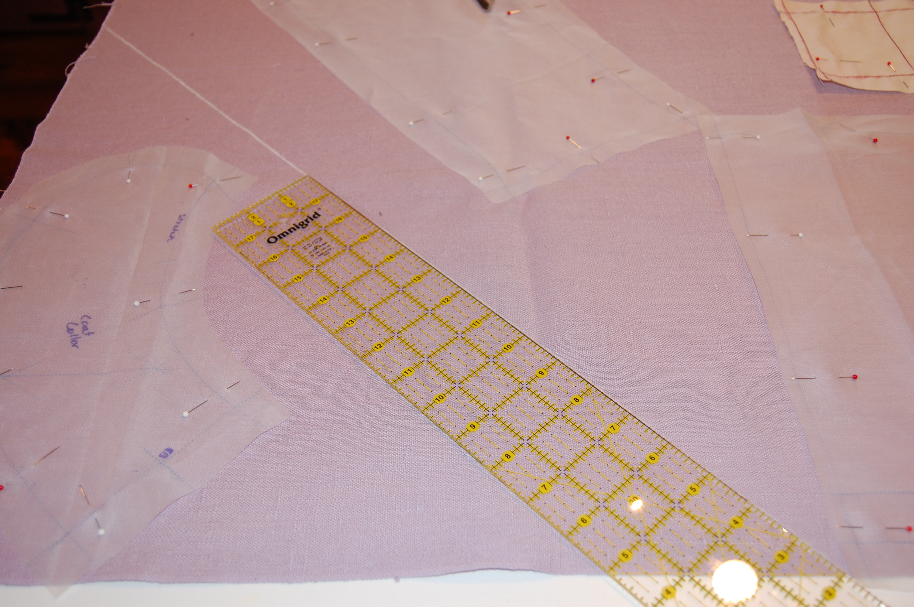 The fact that it is featured with below elbow length sleeves and in a shorter version – perfect for pairing with coordinating dresses – worked in my favor. The entire coat has only 5 pattern pieces: front, back, collar, undercollar, and front facing. First I positioned the tissue pattern pieces on my fabric, strewn out on the floor selvedge to selvedge. I was heartened enough by this exercise to go ahead and make a muslin, so I could have a “real” pattern to work from. All this time, the pink flowered daisy linen lay folded, awaiting her turn.