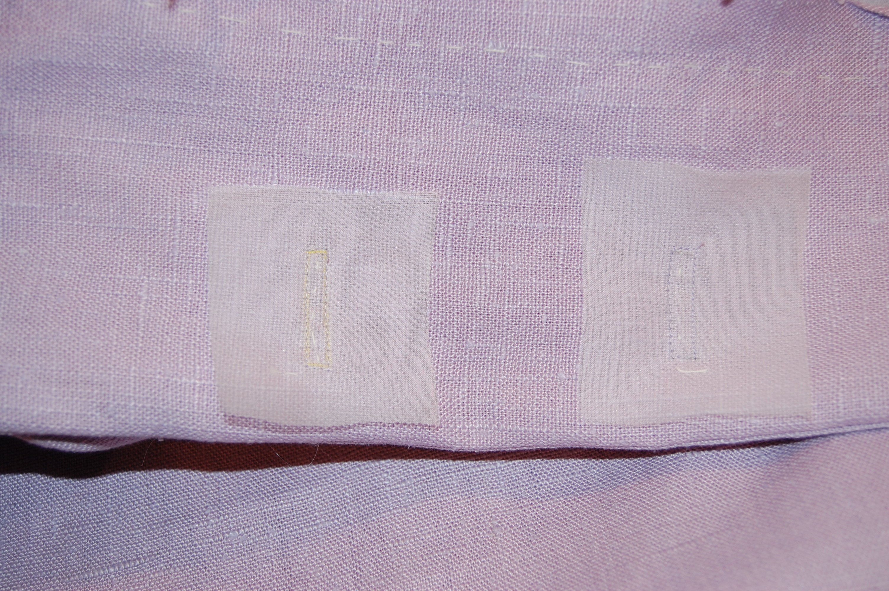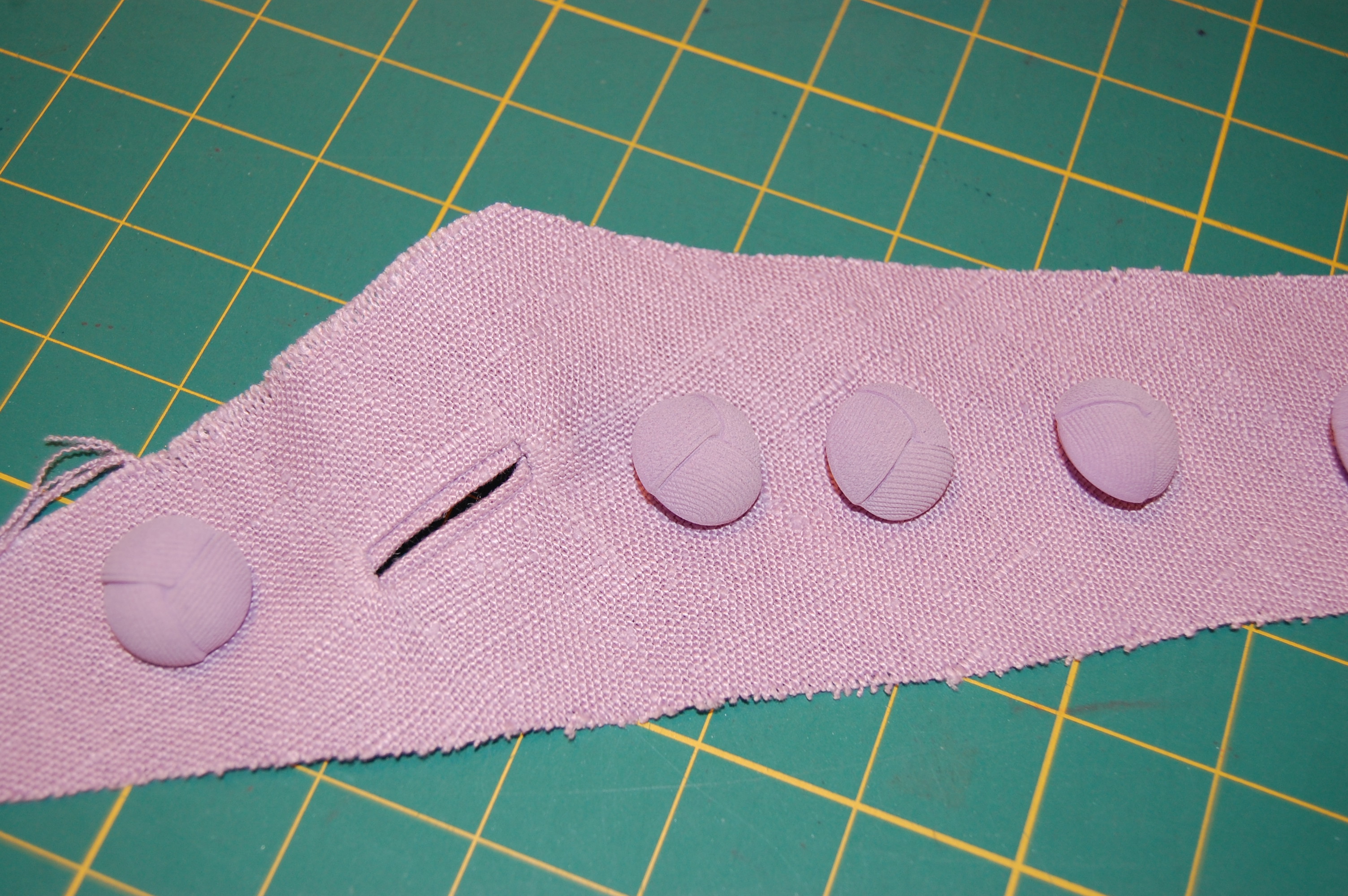I have made a lot of bound buttonholes in my sewing life, but seven of them lined up as the focal point of the front of my coat is still a little intimidating. First of all, I had to find buttons that were “perfect.” I found some lavender buttons on the Britex website, and although they looked like a good match in color and appearance, ordering something like that online is always imprecise. However, when they arrived, they were, indeed, “perfect!” With buttons in hand, I made a sample buttonhole, as I always do.