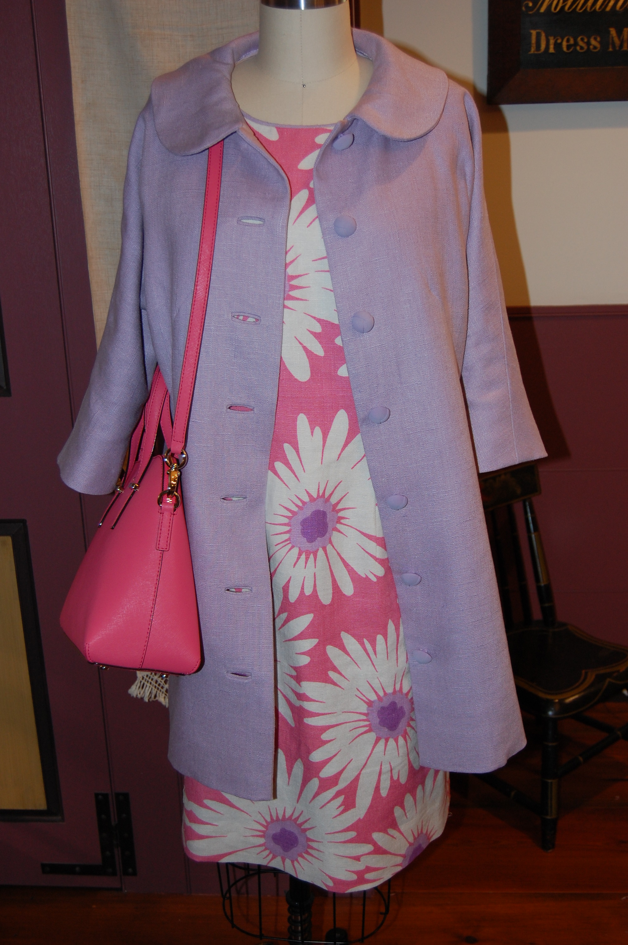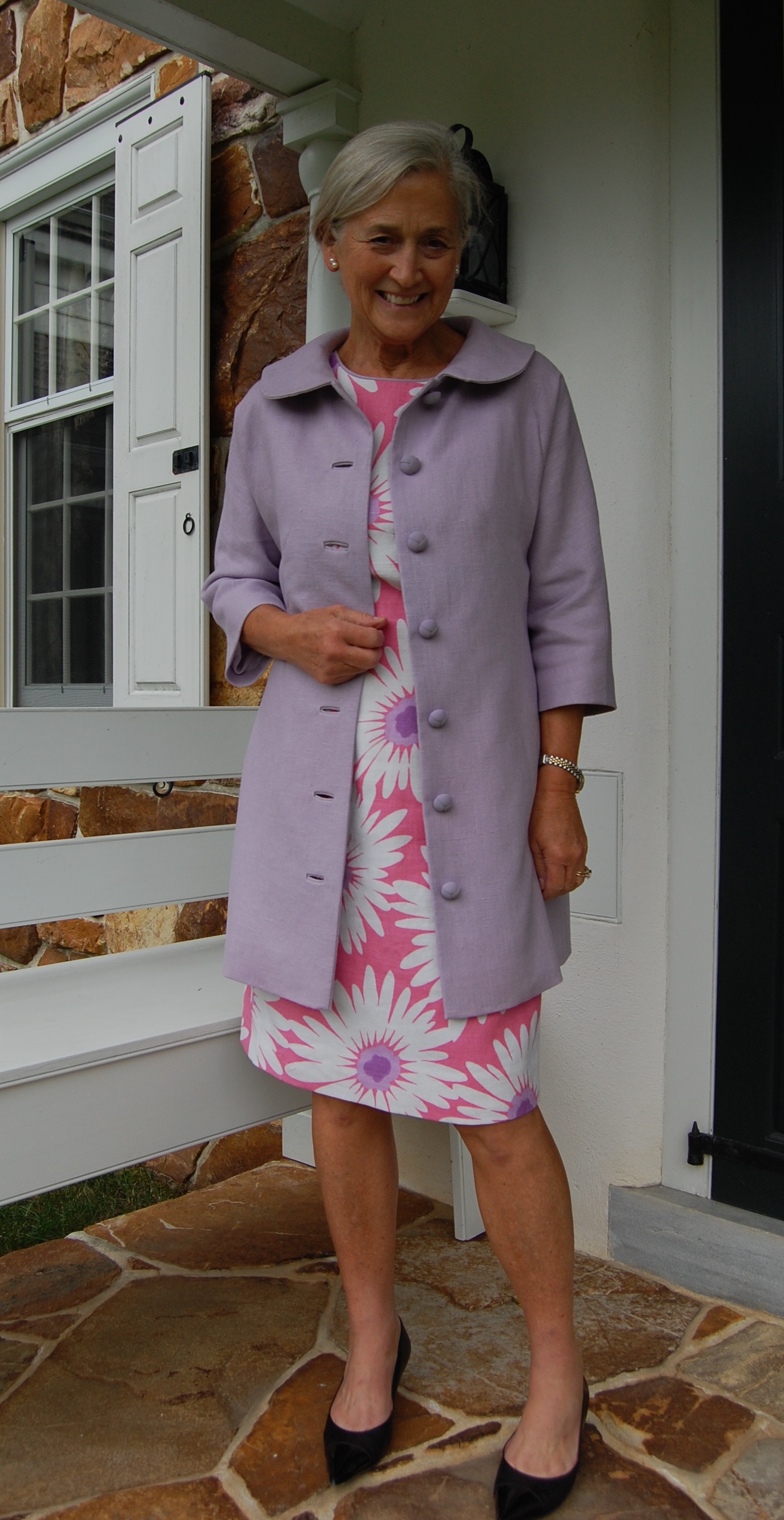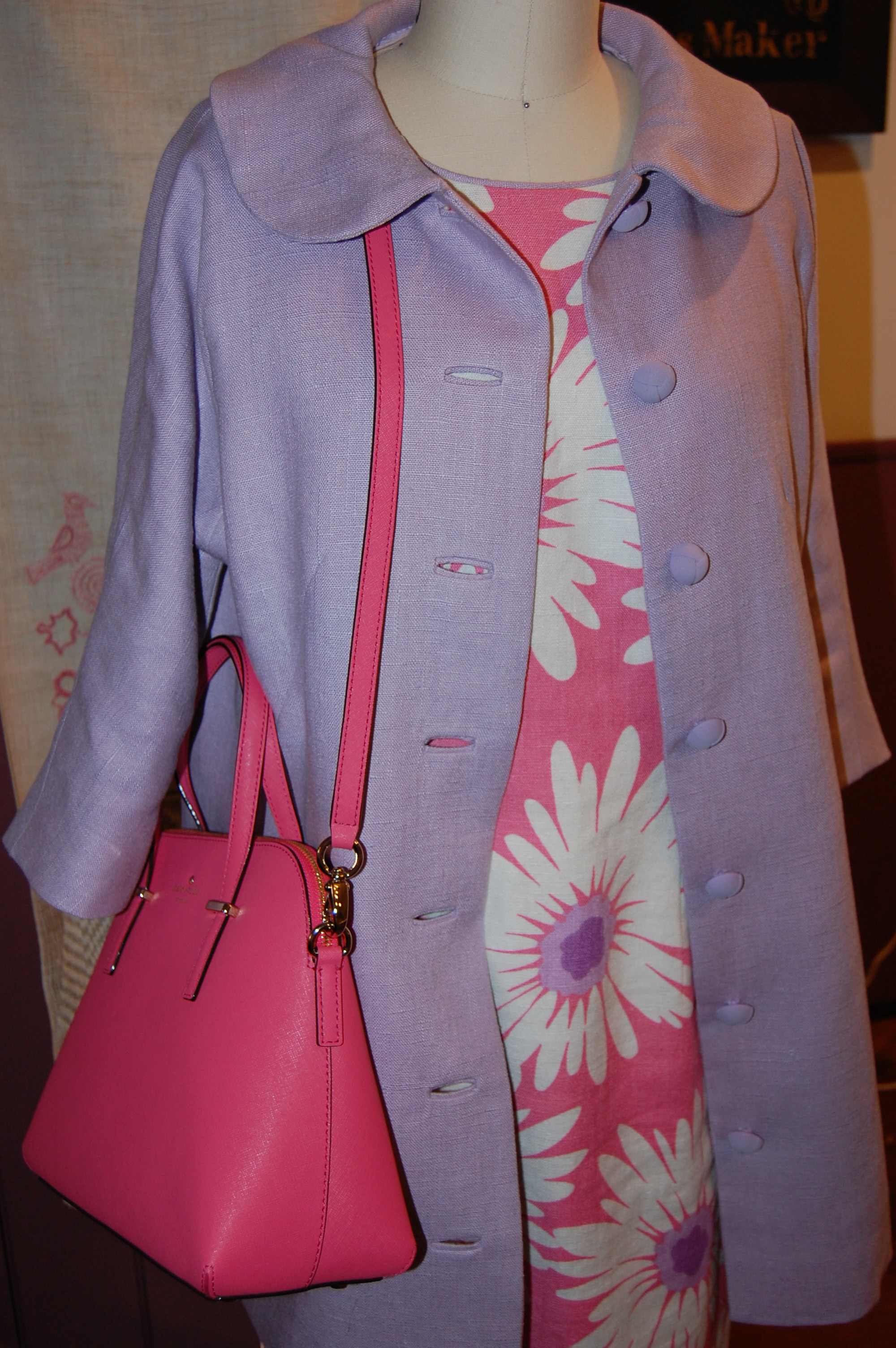 Fortunately my sister was visiting and so I could get her opinion on which one to order. I was a bit smitten with the idea of a bright pink lining, but she wisely asked if I hoped to wear this Spring coat with dresses other than the pink flowered one which had inspired it. Well, yes, I do want that flexibility! That made the decision easy – I chose the pale lavender silk, which is just about a perfect match. I added a bias, flat piped edge to the lining, which is now something I always do with coats and jackets I make. It is so easy and adds so much!