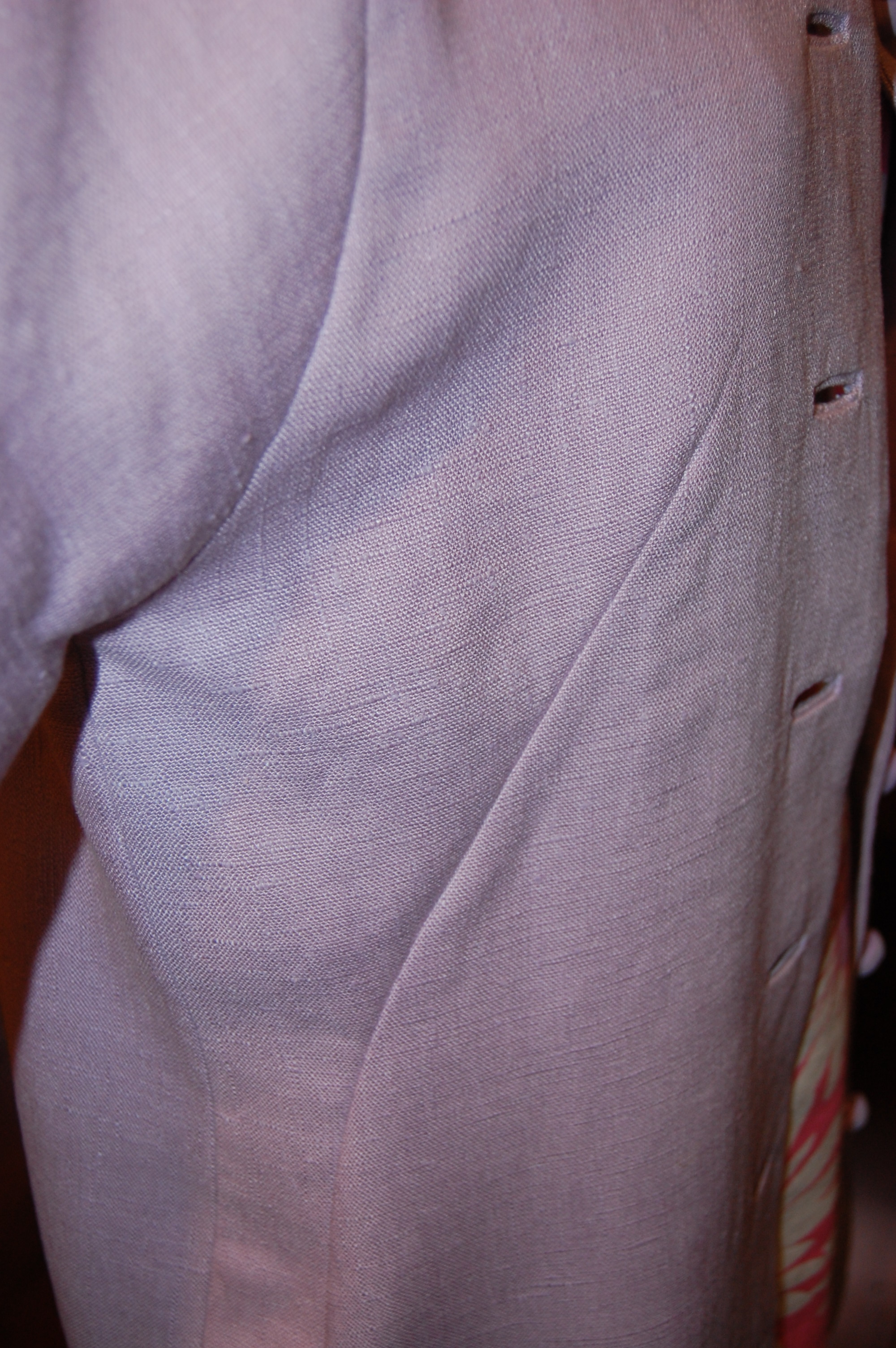 This is a good look at the bound buttonholes and what they add to the overall look of the coat. If you visualize machine made buttonholes in their place, you will get an idea of how vital the bound ones are to the design of the coat.