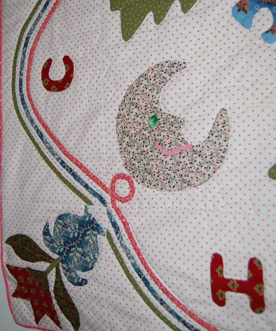A smiling moon, with rick rack mouth and a green button eye.