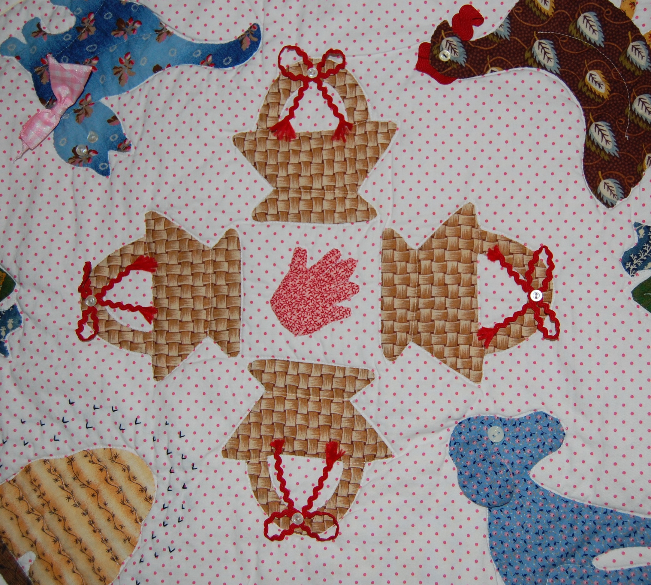 I added the red rick rack bows, secured by vintage buttons, because i thought the center of the quilt needed more “heft” – and I was pleased with the effect this small addition made. (I took this photo before I had trimmed the ends of the rick rack even.)