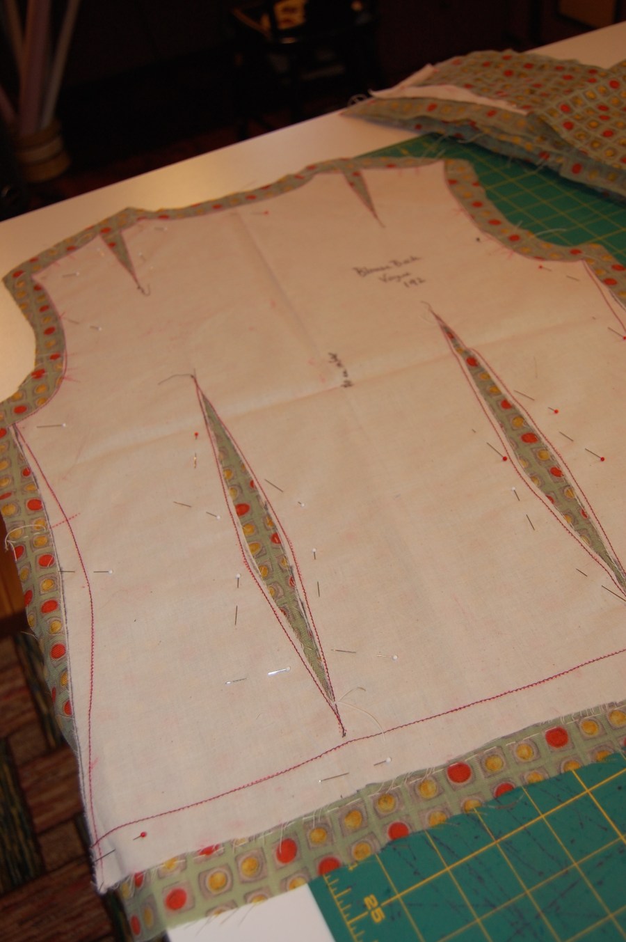 This shows my muslin pattern, cut on the seam lines, and with the darts cut out, so that I could tread trace along all sewing lines.