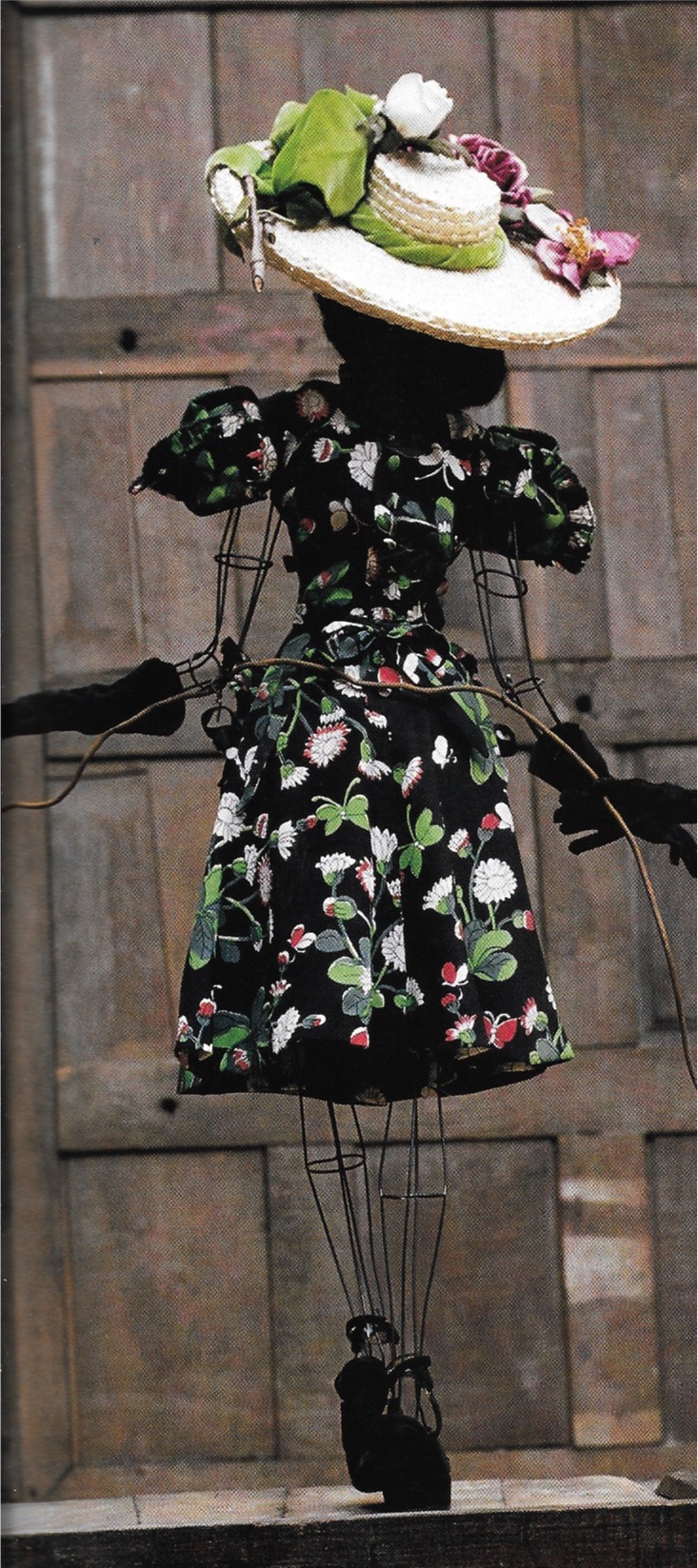 Made from black crepe de Chine printed with daisies and butterflies, trimmed with white lace rosette. The black suede gloves are by Hermes, while the straw boater is by Rose Valois.