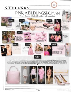 This page from the June/July 2013 issue of Town and Country Magazine gives an interesting timeline of the color pink, “how the color of little girls and baby dolls came of age”: