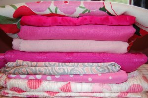 Personally, pink is my favorite color. I am always drawn to it, regardless of its hue. And its hue covers a huge range from palest pink to deepest fuchsia, from bubblegum pink to raspberry red. In thinking about pink for this post, I gathered this stack of pink fabrics from my collection. Just looking at it makes me happy!