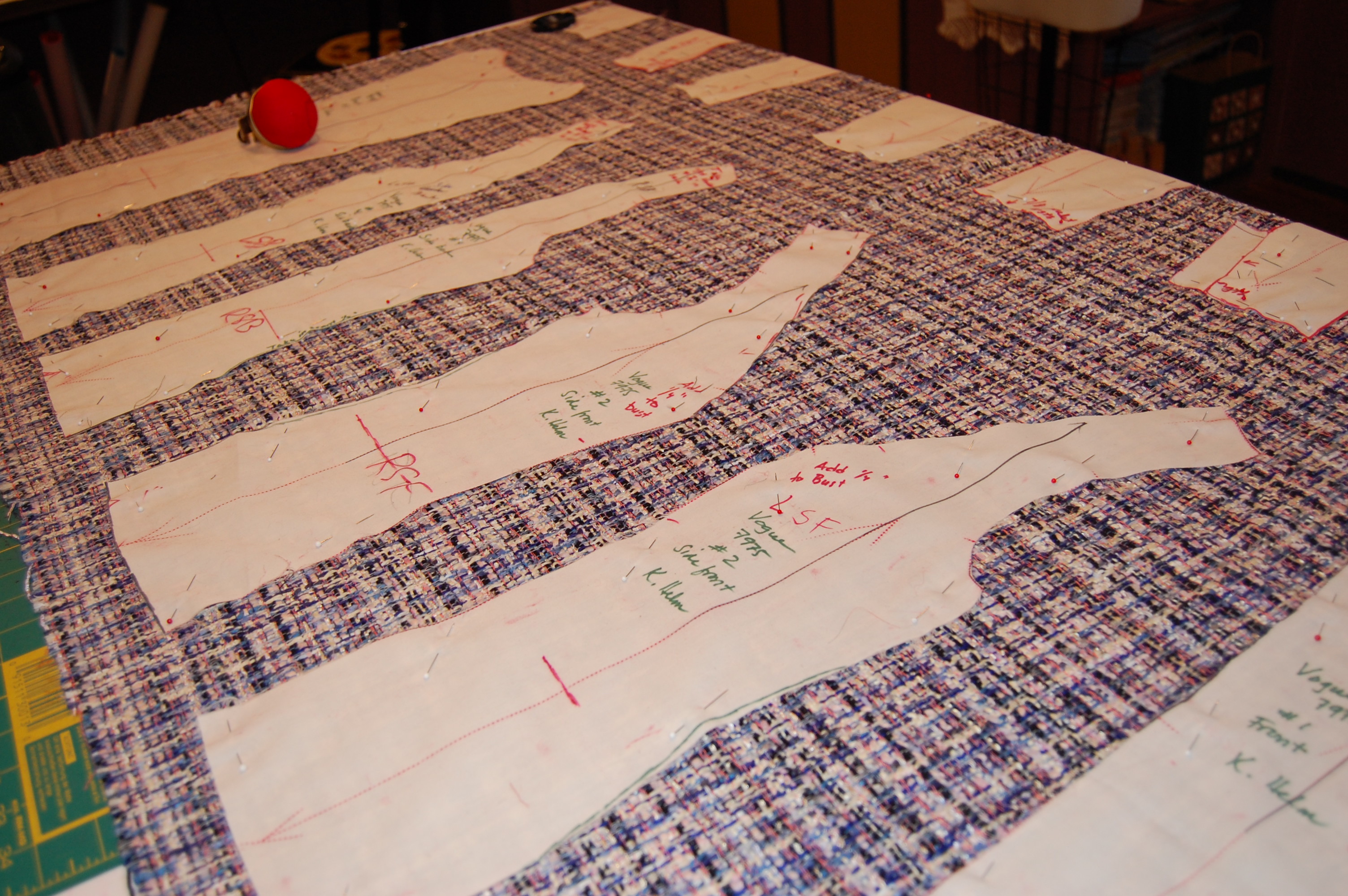 My muslin pattern arranged on the boucle, ready to double-check and cut out.
