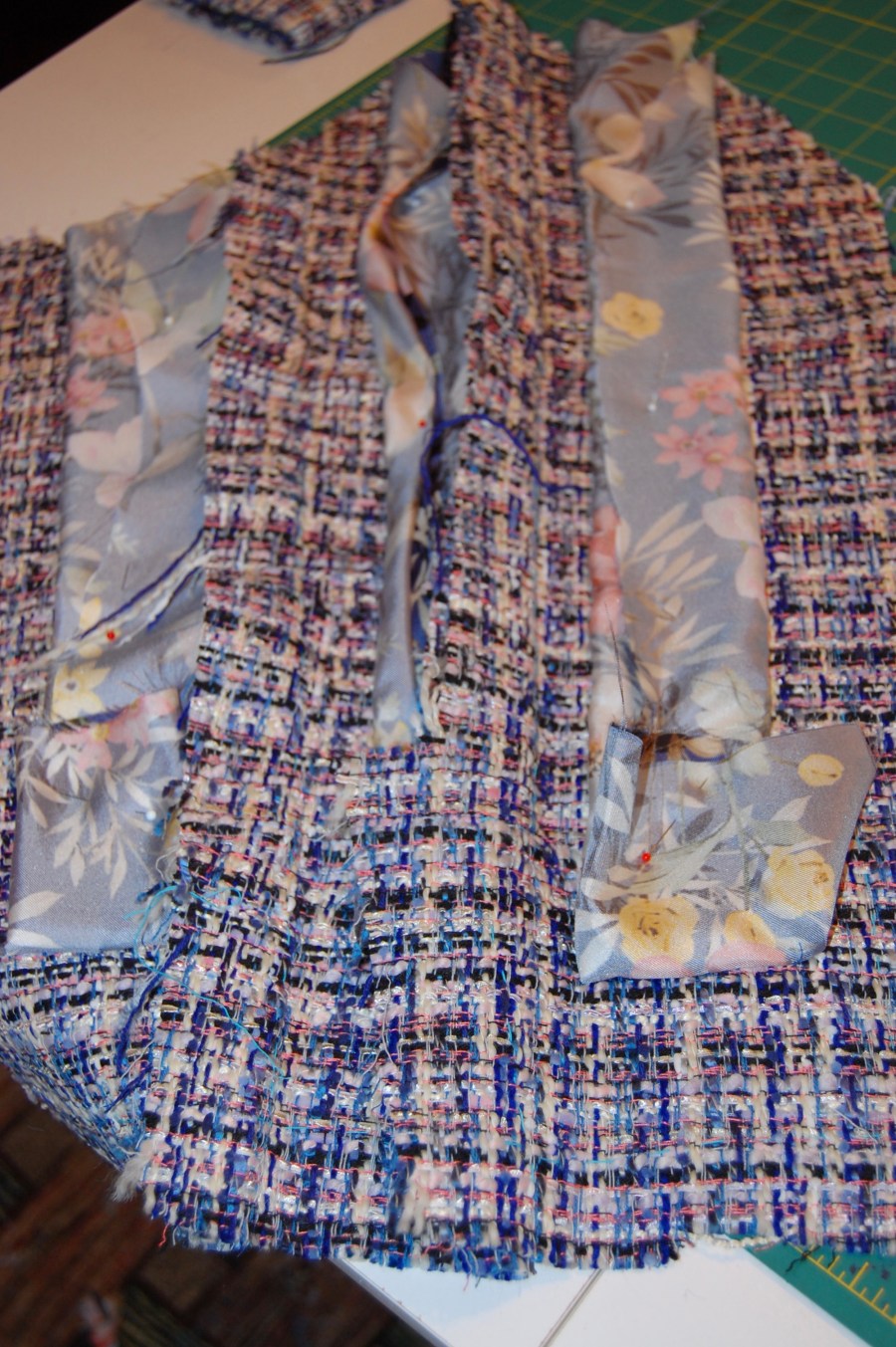 One of the sleeves, quilted, with its lining pinned back.