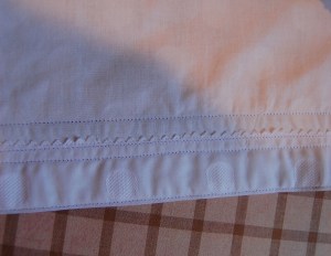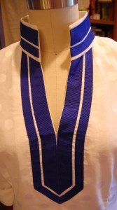 The first thing I did was make the stand collar, so that I could see how the blue Petersham ribbon would look; I was a little worried that the intensity of the blue color might be too much for the delicate white fabric, but I was pleasantly rewarded with a look I liked: