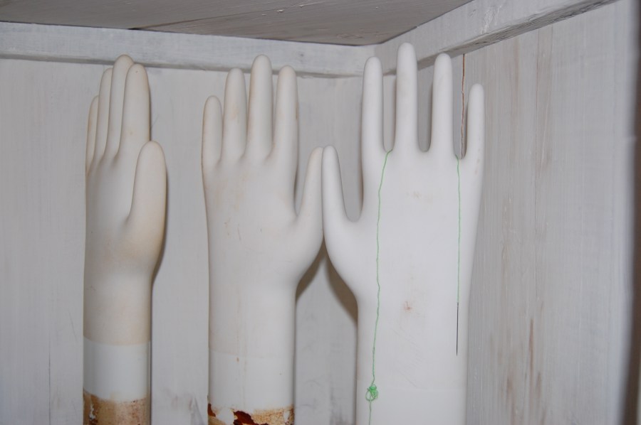 Do you see the needle and thread hanging on the hand at the right?