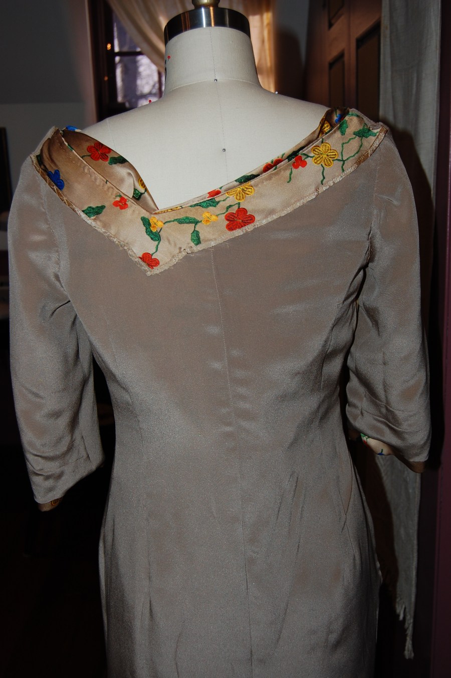 This photo shows the loose lining and also the back neckline. Ordinarily, in couture sewing, facings are reliminated. However, in this case, knowing that the weight of the drape would be added to the back neck, I chose to use the facing for more stability. I finished its edge with Hug Snug tape.