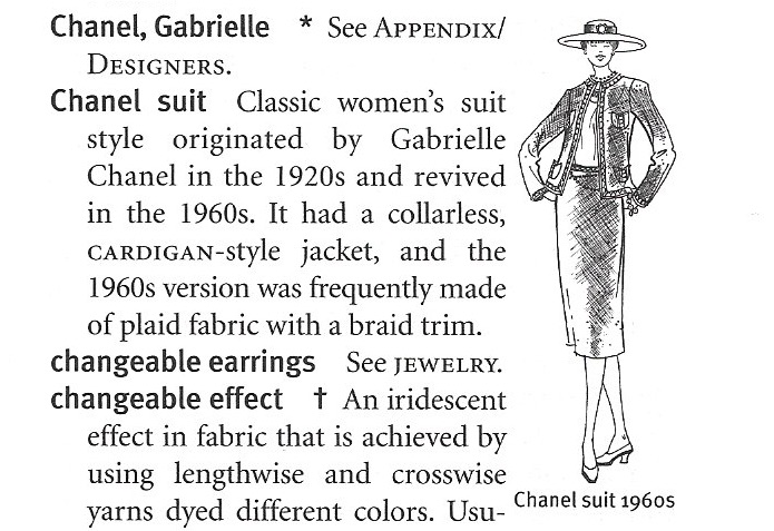 What a succinct and perfect “thumbnail” description of a Chanel Jacket. (The Fairchild Dictionary of Fashion, Third Edition, by Charlotte Mankey Calasibetta and Phyllis Tortora, Fairchild Publications, Inc., New York, New York, 2010, page 65.)
